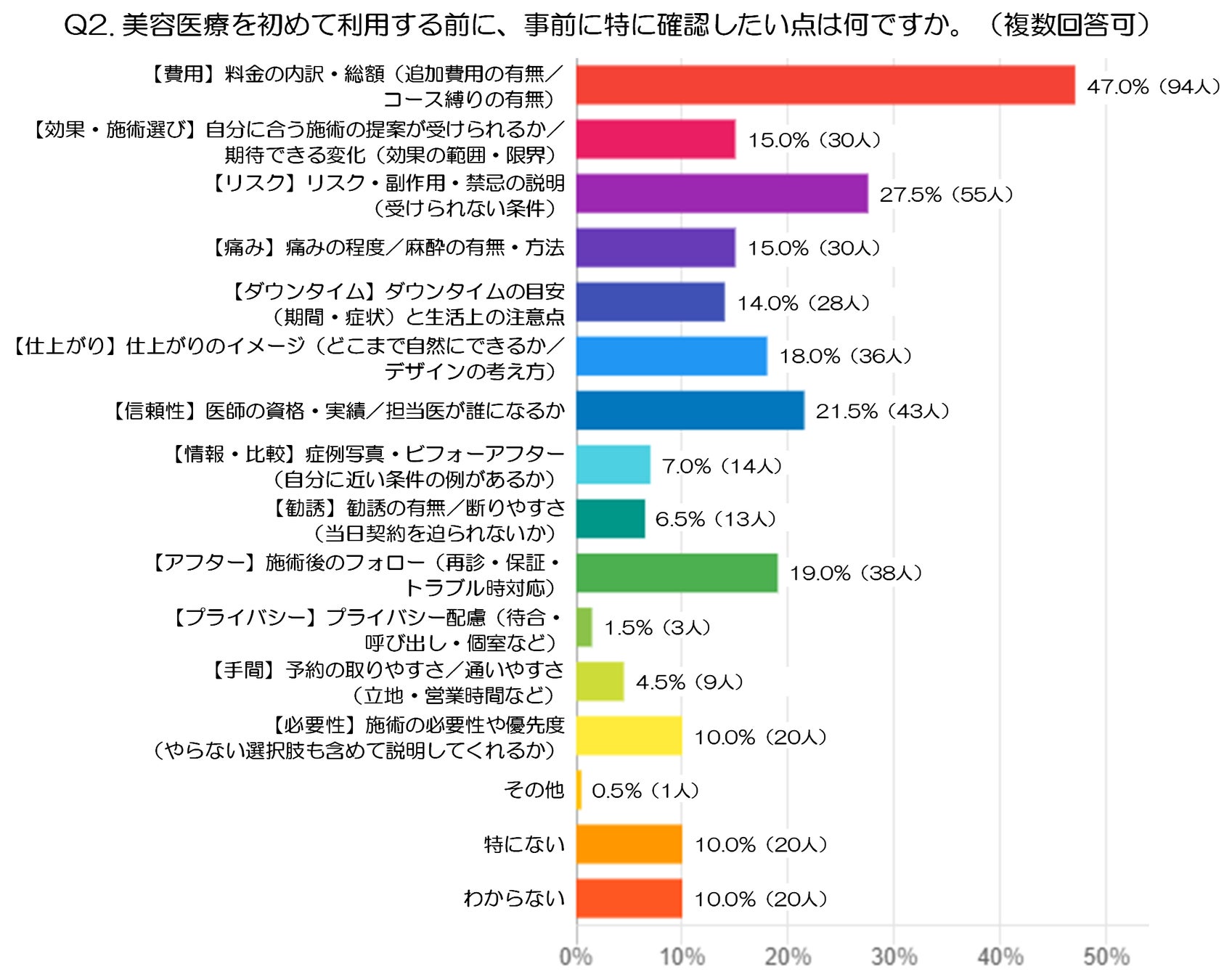 最も多かったのは「【費用】料金の内訳・総額(追加費用の有無/コース縛りの有無)」で、47.0%(94人)でした。初めて美容医療を受ける前の段階では、施術内容そのものよりも、まずは最終的にいくらかかるのかをはっきり知りたいという意識が強いようです。追加費用や契約条件まで確認したい人が多いことからも、想定外の負担が発生しないかを重視していることが分かります。