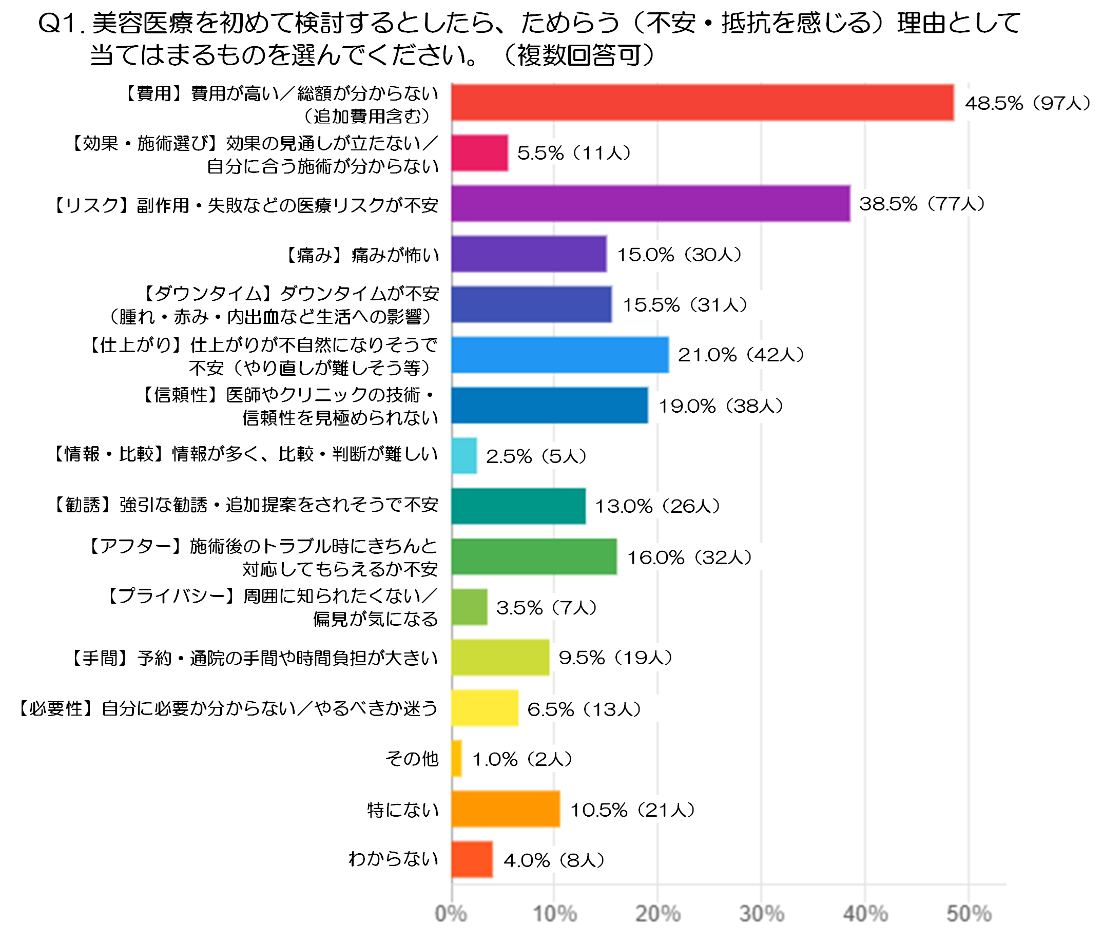 Q1.美容医療を初めて検討するとしたら、ためらう(不安・抵抗を感じる)理由として当てはまるものを選んでください。(複数選択可:注1)