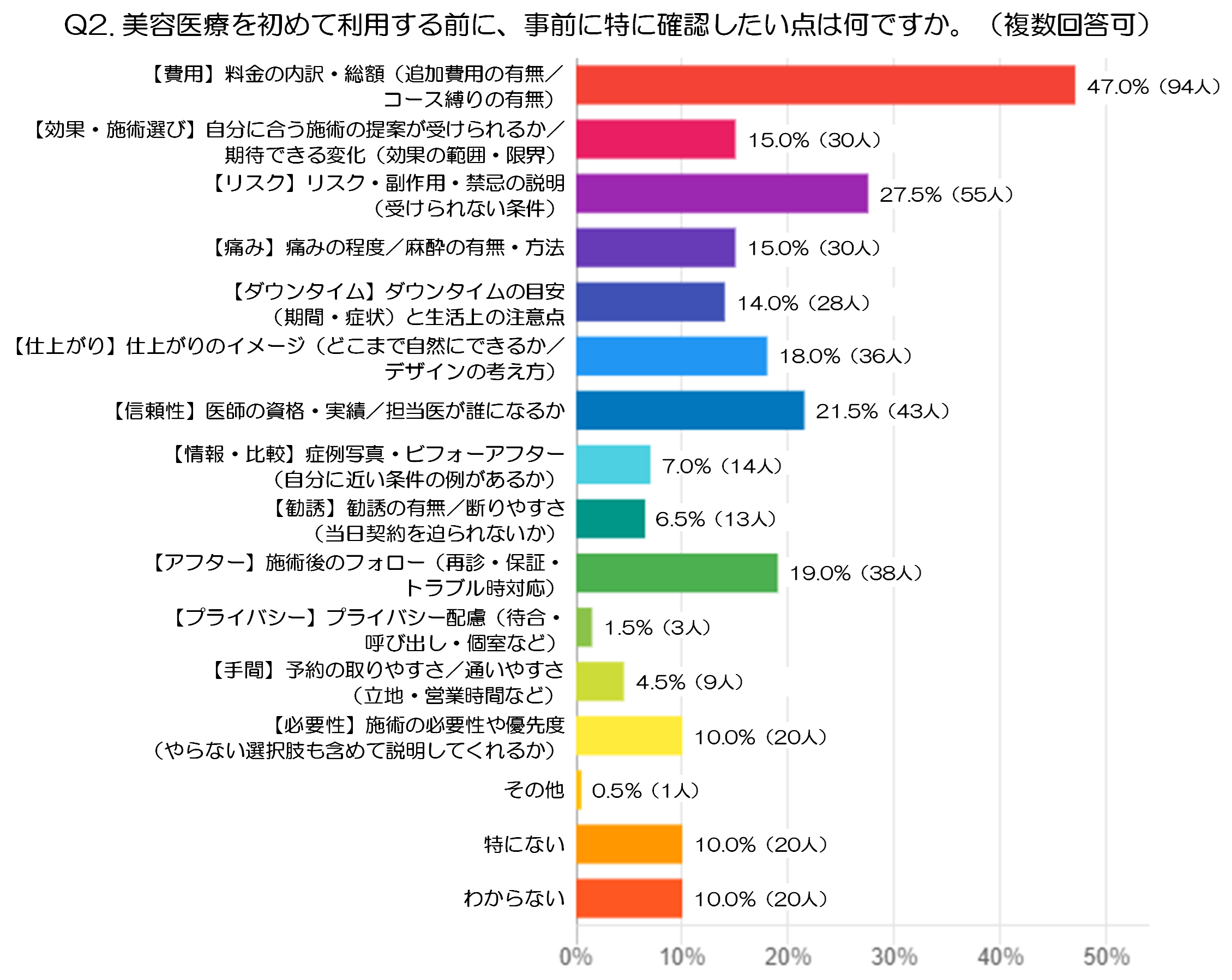 最も多かったのは「【費用】料金の内訳・総額(追加費用の有無/コース縛りの有無)」で、47.0%(94人)でした。初めて美容医療を受ける前の段階では、施術内容そのものよりも、まずは最終的にいくらかかるのかをはっきり知りたいという意識が強いようです。追加費用や契約条件まで確認したい人が多いことからも、想定外の負担が発生しないかを重視していることが分かります。
