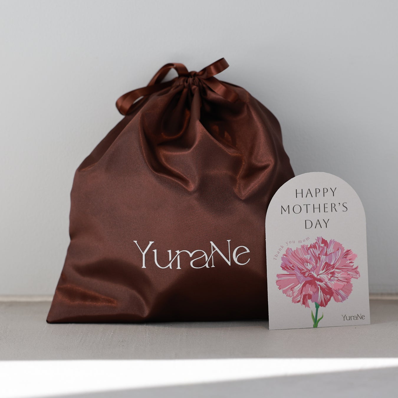 ブランドカラーのブラウンを基調としたサテン生地の巾着は、日常生活でも再利用できるような仕様にこだわりました。母の日の象徴であるカーネーションのメッセージカードも同封し、忙しい中でもラッピングに手間をかけず渡しやすいギフトセット。