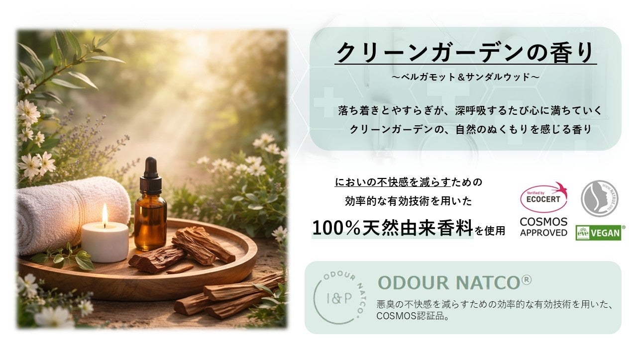 香料にもこだわり抜き、悪臭の不快感を減らすための有効技術を採用した、100%天然由来香料を使用。(COSMOS認証・VEGAN認証・ECOCERT認証取得)