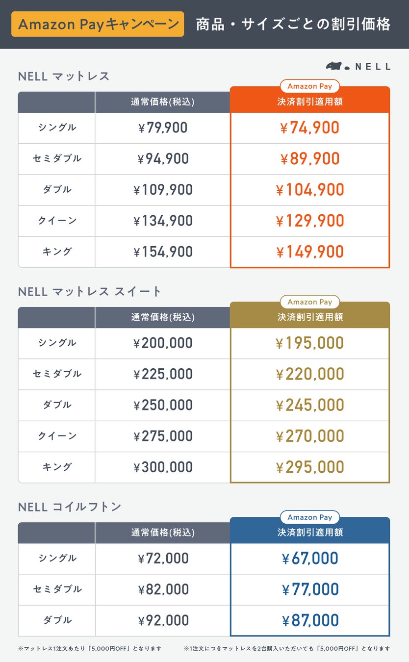 【もれなく5,000円オフ!】「NELL マットレス」、Amazon Pay決済でお得に購入できる「Amazon Payキャンペーン」を開催 この春発売・人気商品「NELL コイルフトン」も対象!