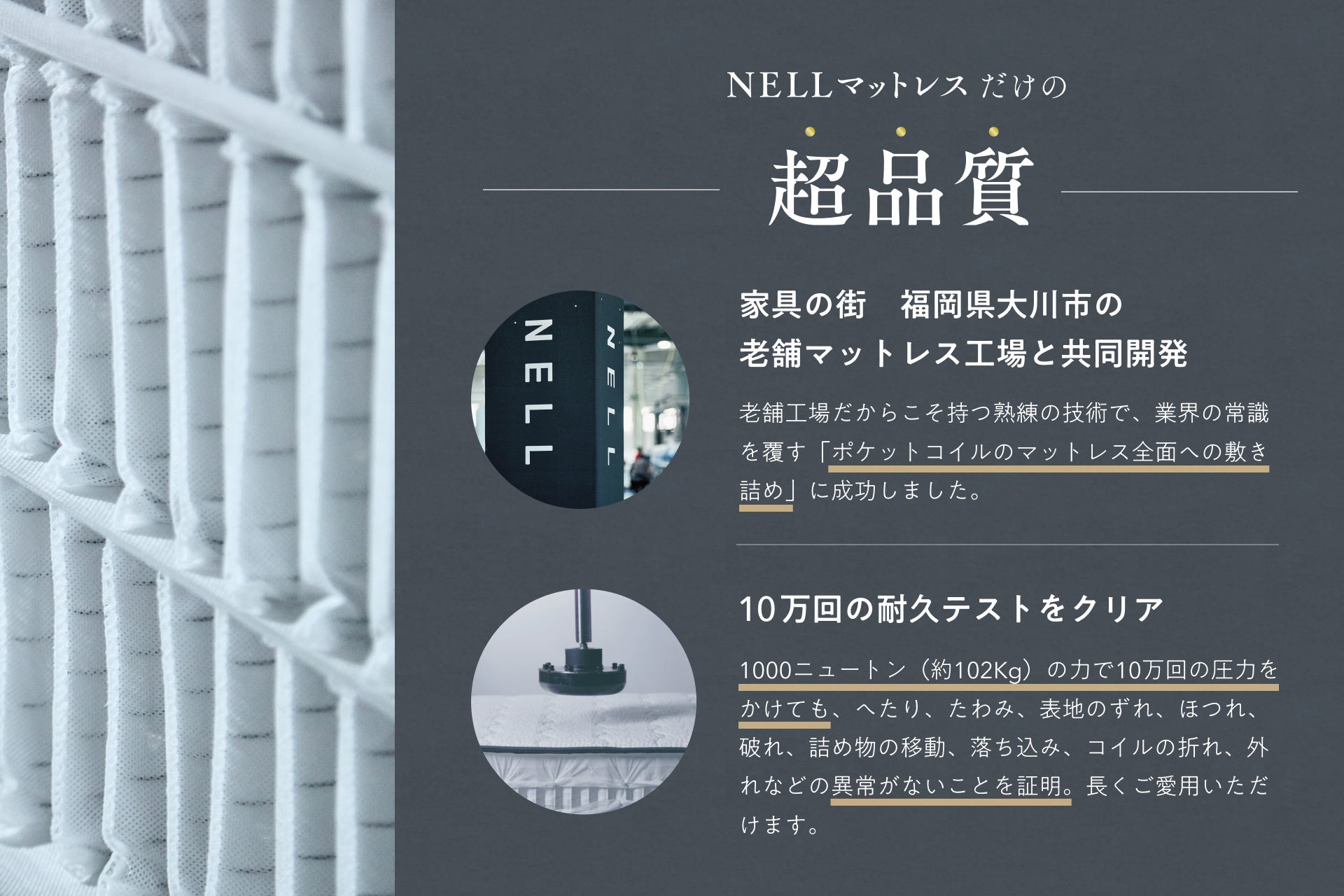 「NELL マットレス」は、家具の街として知られる福岡県・大川市の老舗マットレス工場との共同開発で誕生しました。業界の常識を覆す、多数のポケットコイルをマットレス全体に敷き詰め、かつ10万回の耐久テストにも耐えうる「超品質」を実現しました。