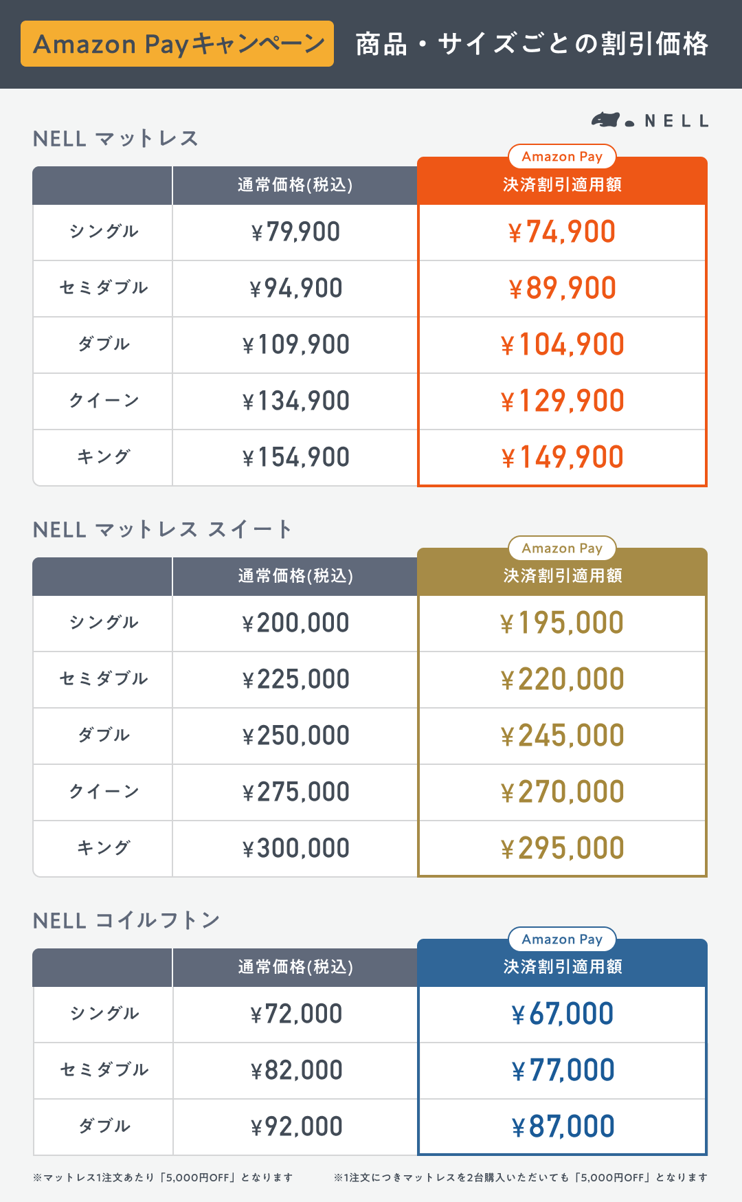 対象条件:「NELL マットレス」もしくは「NELL マットレス スイート」「NELL コイルフトン」を1台以上含むご注文で、かつお支払い方法を「Amazon Pay」に設定