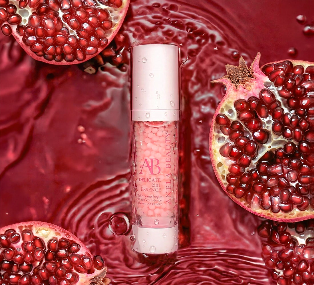透明感*¹をもたらすザクロ果実エキスをはじめとする植物由来成分*²を配合したエッセンスと、3種のボタニカルオイル*³をひとつにした2in1処方。