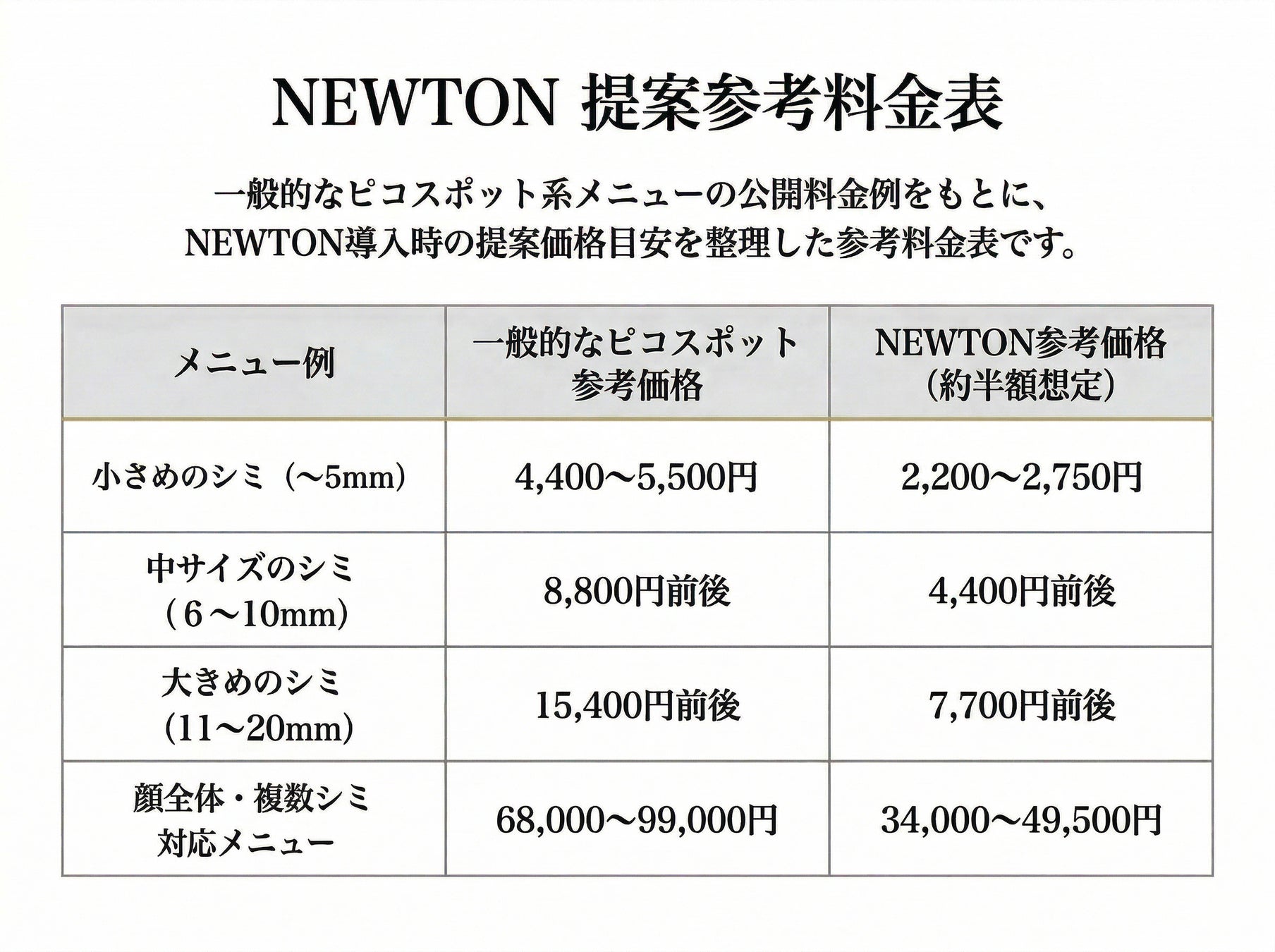 導入店舗では、一般的なピコスポット系のシミケア価格を参考にしながら、より利用しやすい価格帯でのサービス設計が可能です。公開されている参考例では、ピコスポットは5mmあたり4,400円、または〜5mmで5,500円、顔あて放題で68,000円〜99,000円程度の価格帯が確認できます。NEWTONでは、こうした相場と比較しながら、約半額をひとつの目安とした提案設計も検討できます。