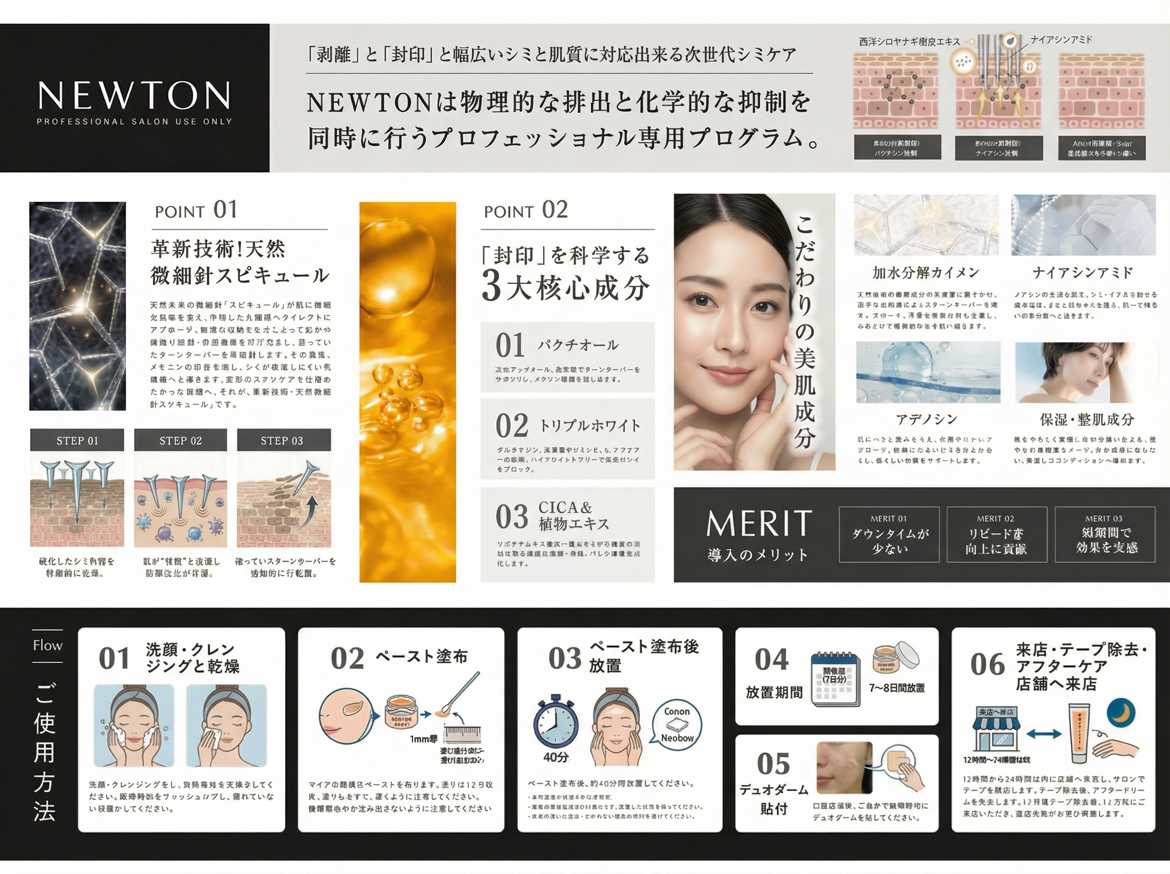 NEWTON エッセンス(5ml×2本)、NEWTON ペースト(5g×1本入×2箱)、NEWTON アフタークリーム(10g×1個入×5箱)、NEWTON 美容液(30ml)、NEWTON ピーリングジェル(100ml)が主な商品ラインナップ。施術では、ペーストタイプによるポイントケアに加え、ペースト使用後1カ月経過後のシミ戻り・色素沈着ケアや、敏感肌向けの液剤タイプ使用など、肌状態に応じた提案が可能です。