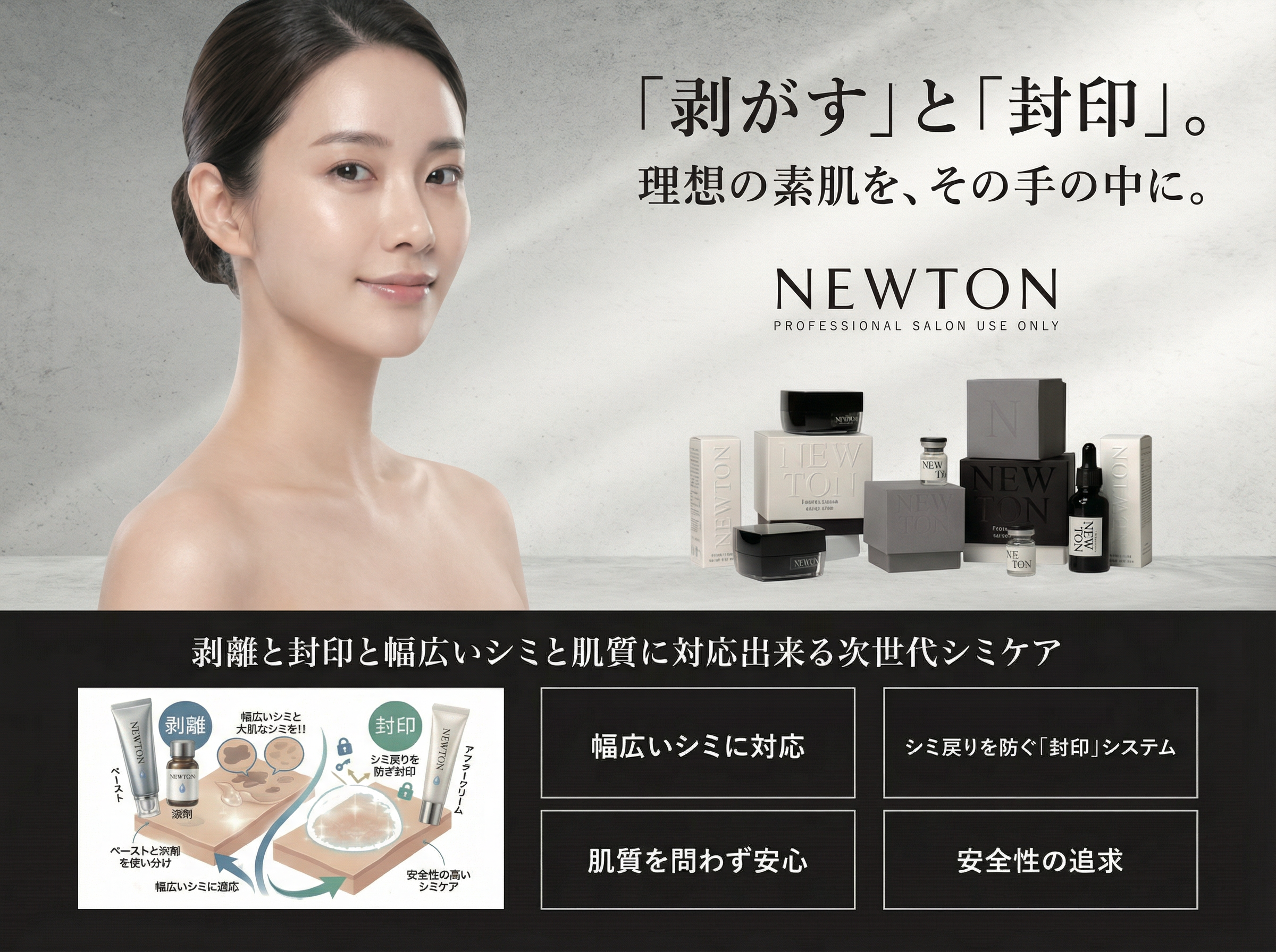 「シミは多くの方にとって長年の悩みでありながら、価格、痛み、不安感などからケアをためらう方も少なくありません。NEWTONは、そうした方々に向けて、サロン・クリニック・美容室などの現場から新しいシミケアの選択肢を届けたいという思いから提案を進めています。幅広いシミにアプローチしながら、施術後のケアまで含めて丁寧に提案できることが、NEWTONの大きな魅力だと考えています。」