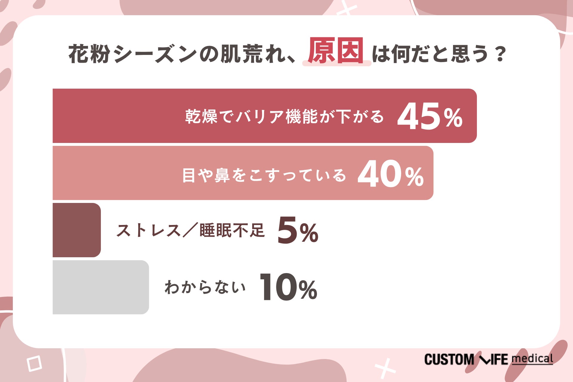 また、「花粉シーズンの肌荒れ、原因は何だと思う?」と質問したところ「乾燥によるバリア機能の低下」が45%と最多。「目や鼻をこすっている(40%)」も多く、花粉症の自覚症状と連動した物理的・機能的な二重ダメージへの認識が高いことがわかります。
