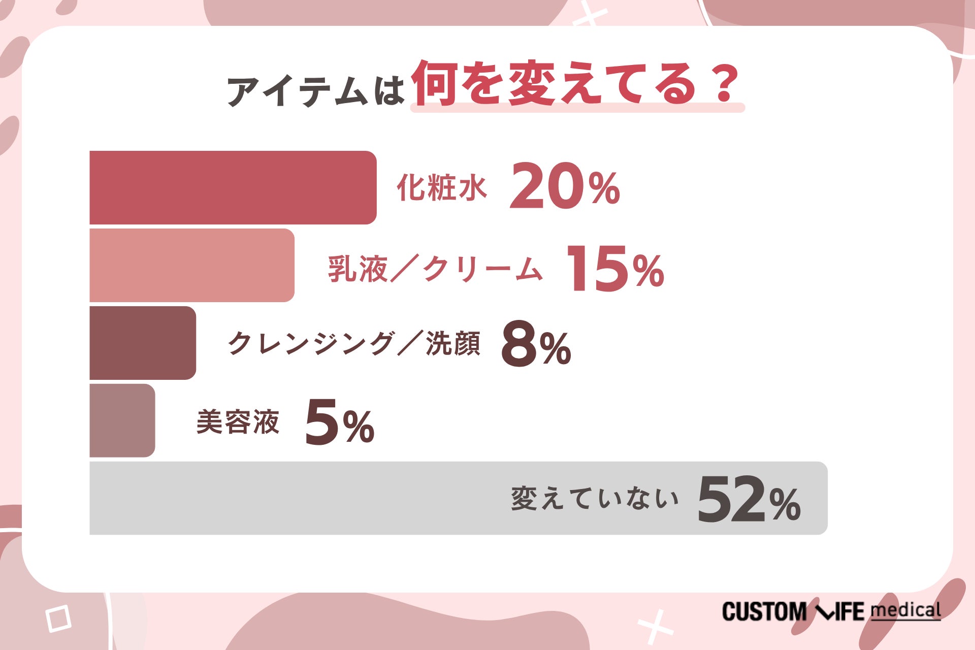 アイテムを変えている場合、「化粧水」(20%)と「乳液・クリーム」(15%)が中心。毎日直接肌に触れる基礎ケアアイテムから見直す傾向が見られました。