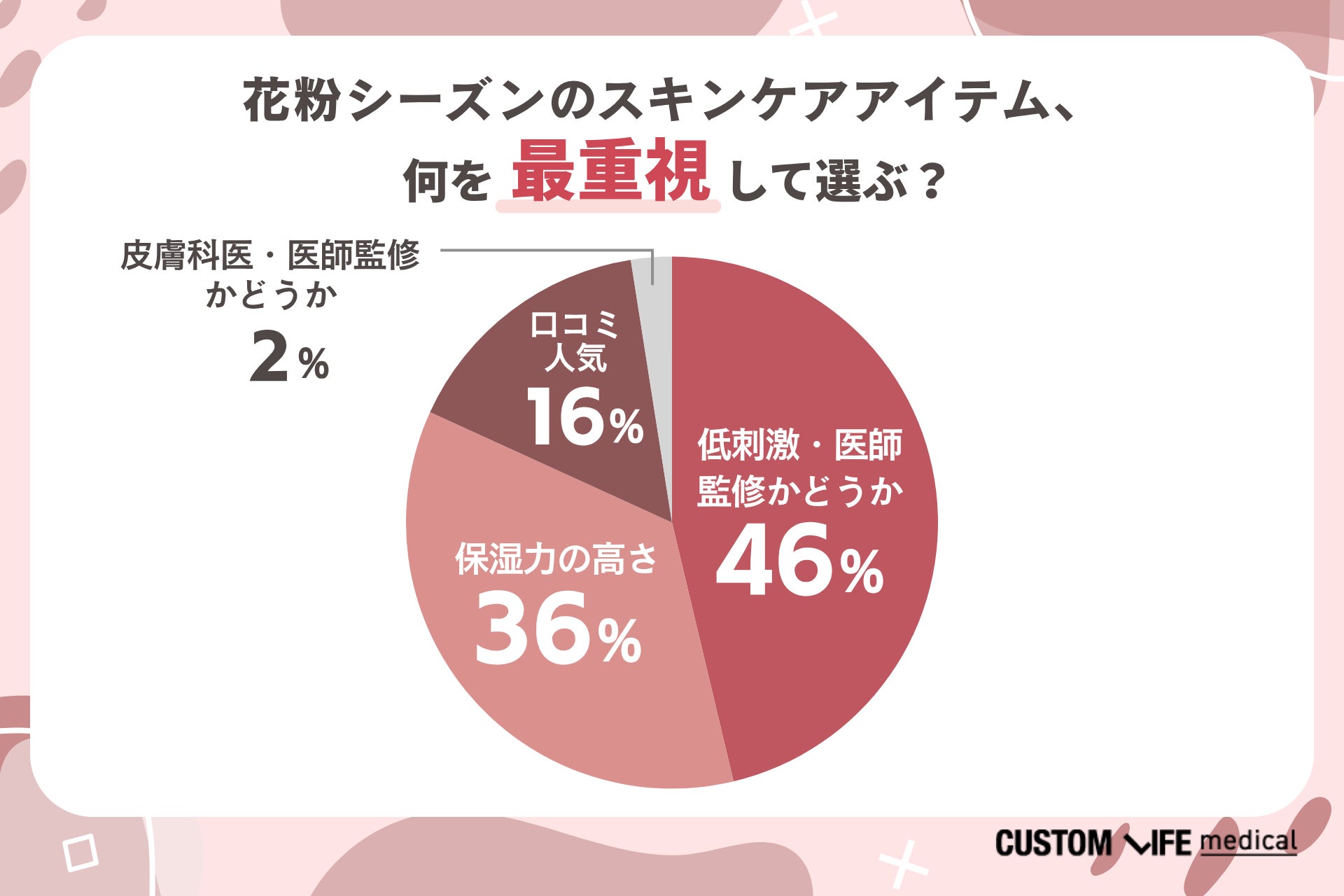「花粉シーズンのスキンケアアイテム、何を最重視して選ぶ?」という質問の結果、「低刺激・無添加かどうか」(46%)と「保湿力の高さ」(36%)が重視されている結果となりました。合計82%を占めており、多くの人が肌へのやさしさと乾燥対策を重視していることがわかります。