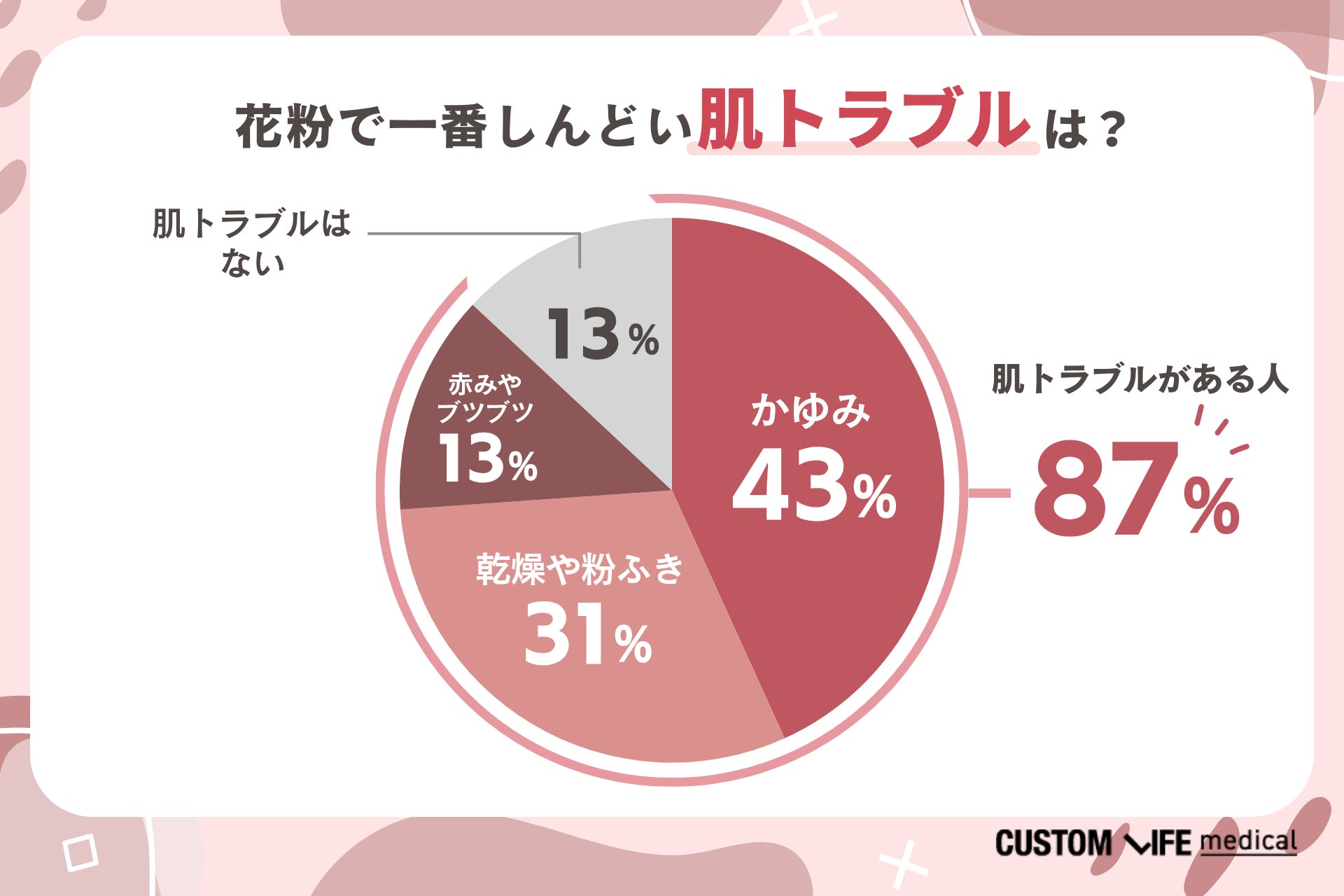 カスタムライフmedicalでは、運営会社である株式会社カスタムライフの公式アカウント「homenote(フォロワー約18万人)」にて、フォロワーを対象としたアンケートに加えインターネット調査を実施し「花粉シーズンの肌トラブル実態調査」を行いました。