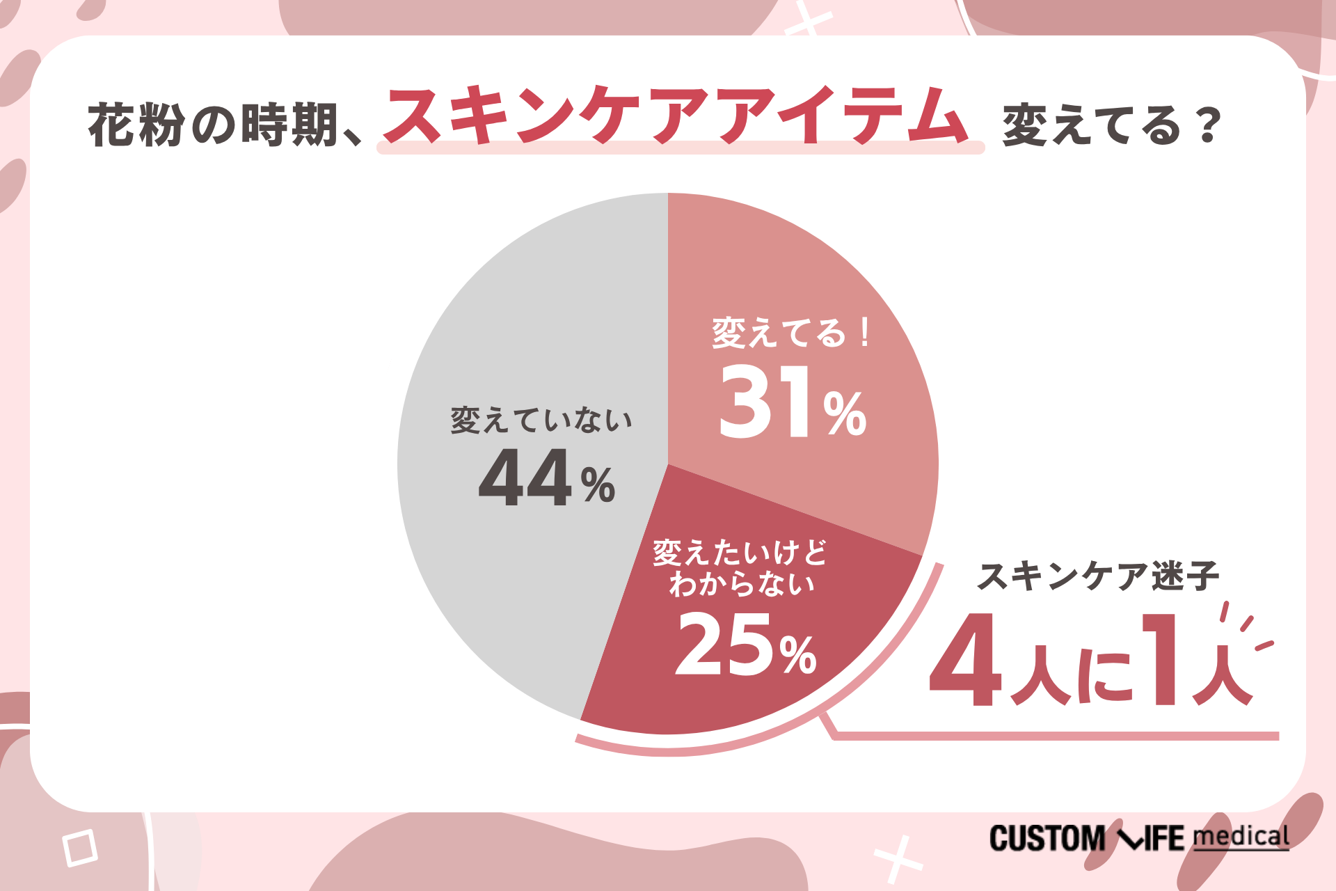 また、「変えていない・不明」は8%でした。この背景には、「スキンケアを変えたいけれど、何を選べばいいかわからない」と感じている人の存在があると考えられます。花粉シーズンのスキンケア選びに悩む人は少なくなく、肌状態や原因に自覚があっても肌悩み・年齢といった自分にあった選び方情報にたどり着けていないといった課題がわかる結果といえるでしょう。