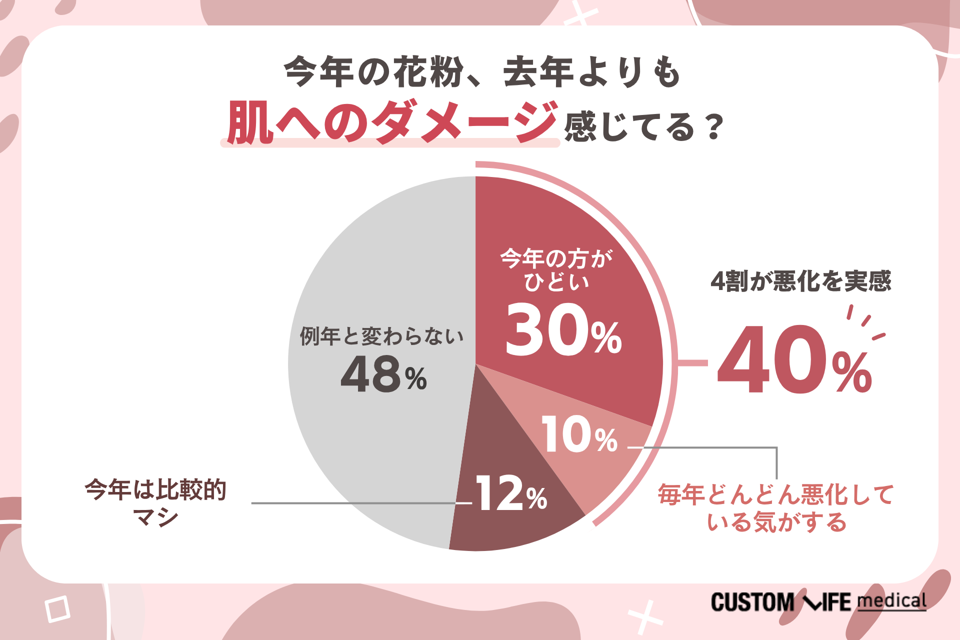 カスタムライフmedicalでは、運営会社である株式会社カスタムライフの公式アカウント「homenote(フォロワー約18万人)」にて、フォロワーを対象としたアンケートに加えインターネット調査を実施し「花粉シーズンの肌トラブル実態調査」を行いました。