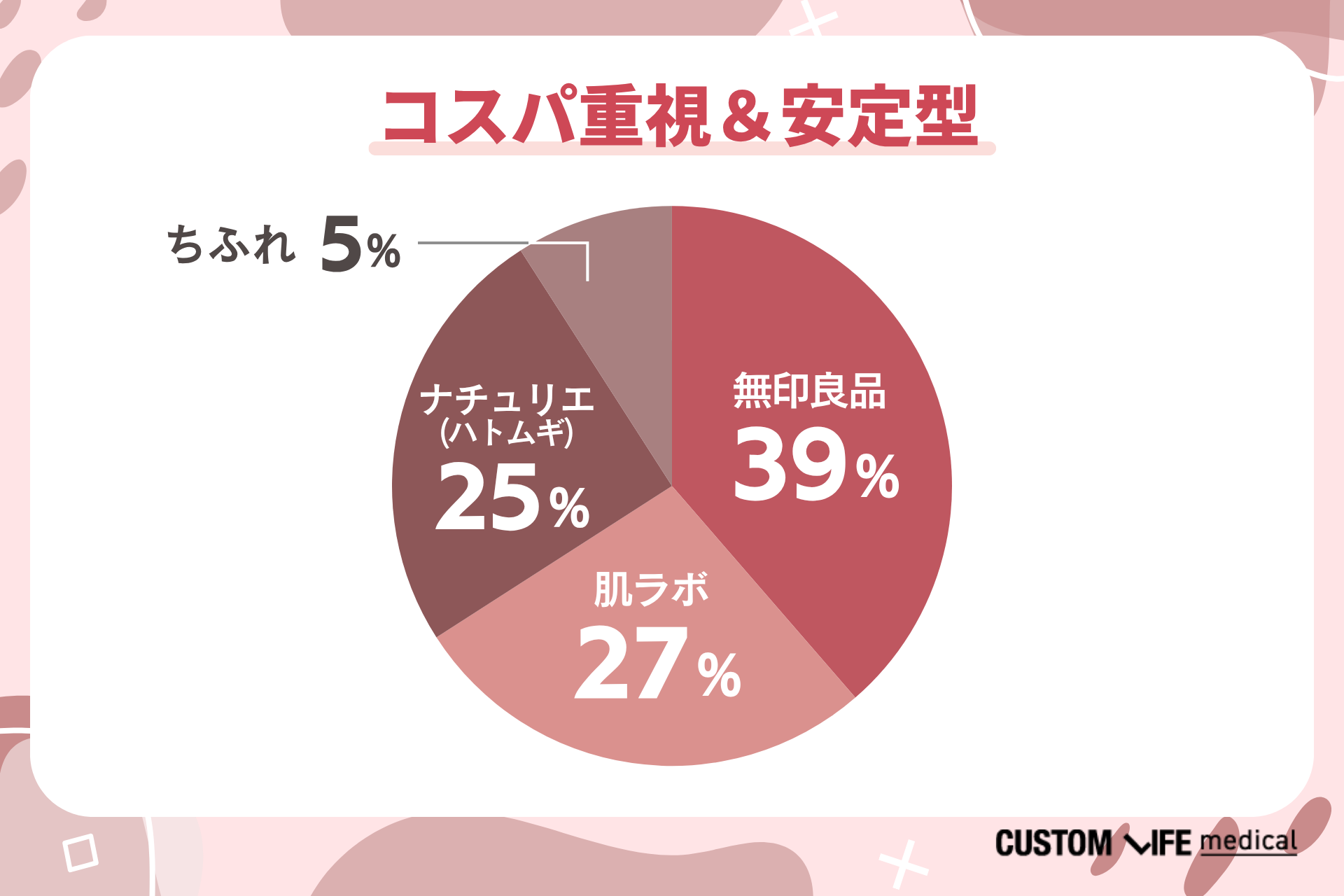 全カテゴリの中で最も多くの票を集めたのが、この層でした。ブランド別では無印良品が11%でトップ、肌ラボが8%、ナチュリエ(ハトムギ化粧水)が7%で続きました。花粉シーズンは肌が敏感になりやすいため、刺激への不安から新しいアイテムを試すのではなく、使い慣れたスキンケアを継続する人が多いことがわかります。