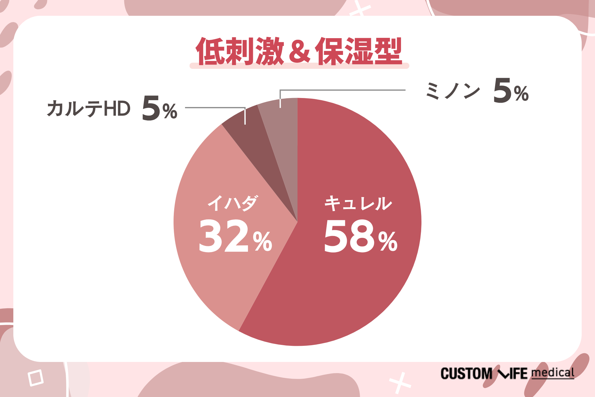 回答が集まったブランドの中でも、特に存在感を示したのがキュレルです。全体の15%を占め、全ブランドの中でトップとなりました。支持はスプレーやクリーム、洗顔料など幅広いアイテムに分散しており、ブランド全体への信頼の高さがうかがえます。次いでイハダが8%で続き、カルテHDとミノンはそれぞれ1%でした。