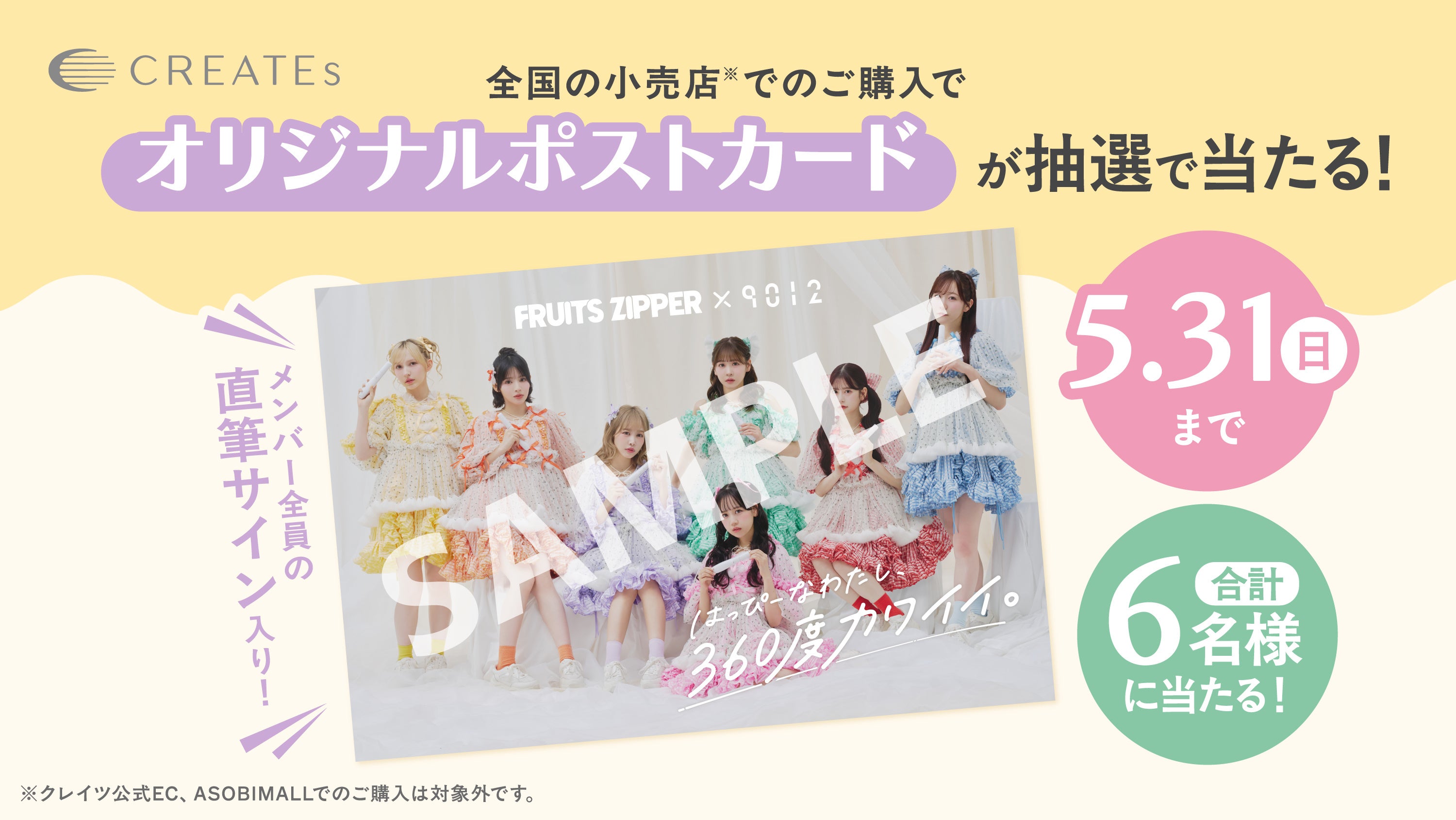 2026年5月31日(日)までのキャンペーン期間中、全国の小売店で「FRUITS ZIPPER×9012 コラボ限定セット」をお買い上げのお客さまの中から抽選で6名様に、FRUITS ZIPPERメンバー全員の直筆サイン入り「FRUITS ZIPPERオリジナルポストカード」をプレゼントいたします。詳細ページより、応募方法・注意事項をご確認の上ご応募ください。
