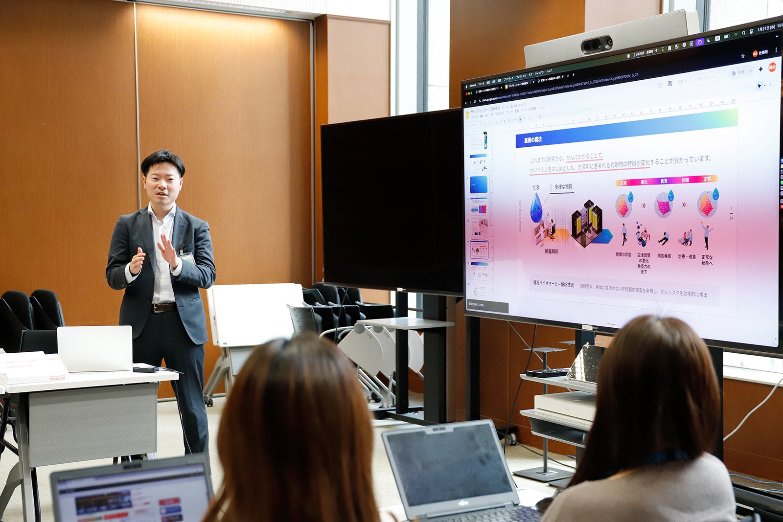 サリバテックからは、だ液中の代謝物の変化を捉えることで、ステージ0や1といった超早期でリスク評価が出来る可能性を説明。日本生命の礒野氏からは「既存のがん検診を補完する『2段階理論』での訴求は、健康意識の高い層や経営者層にも響く」との提言をいただきました。 -