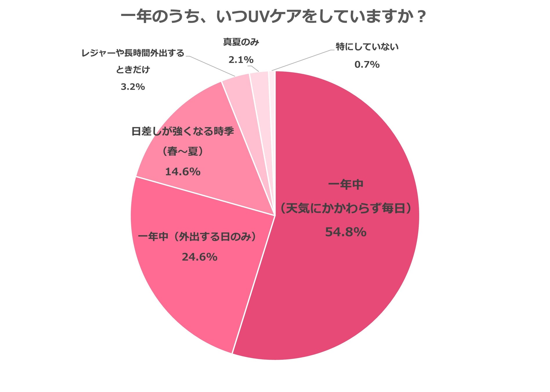 『美ST』読者の美容への意識の高さはUVケアにも表れており、54.8%が「一年中(天気にかかわらず毎日)」と回答。「一年中(外出する日のみ)」も合わせると、実に79.4%が一年中、UVケアをしています。