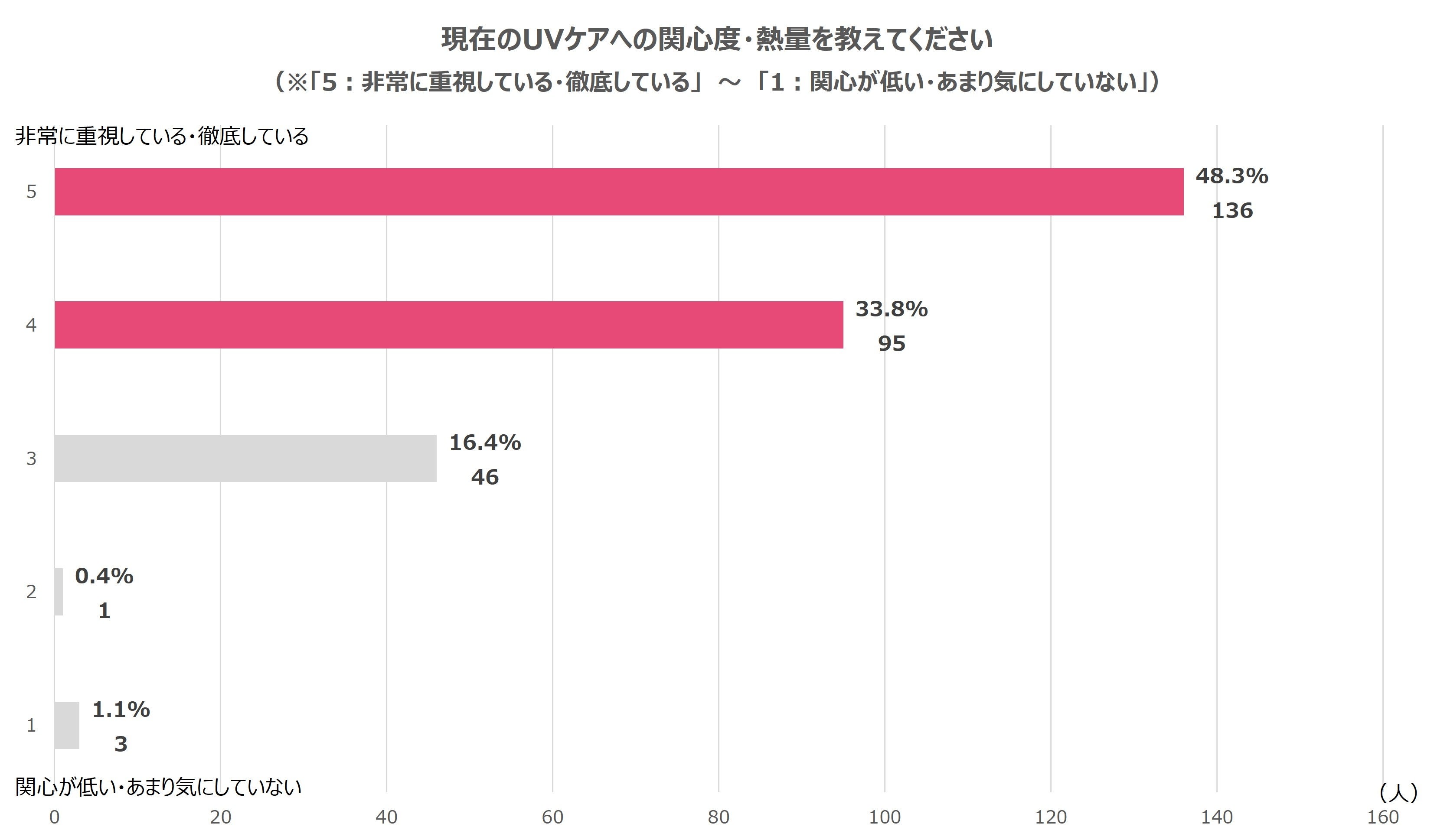 実際に「UVケアへの関心度・熱量」を5段階で聞いたところ、「非常に重視している・徹底している」との回答が48.3%でした。5段階のうちの5と4を合わせると実に8割以上がUVケアに非常に高い関心、熱量を持っていることがうかがえます。