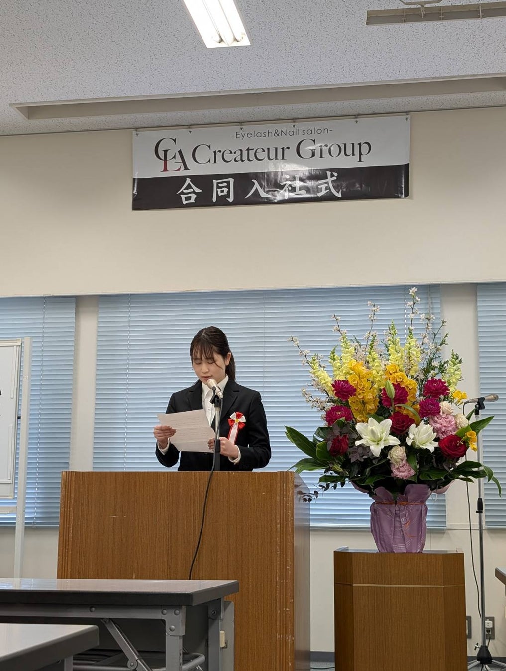 入社式では、社長の祝辞、新入社員代表からの抱負、先輩社員からの激励の言葉がありました。