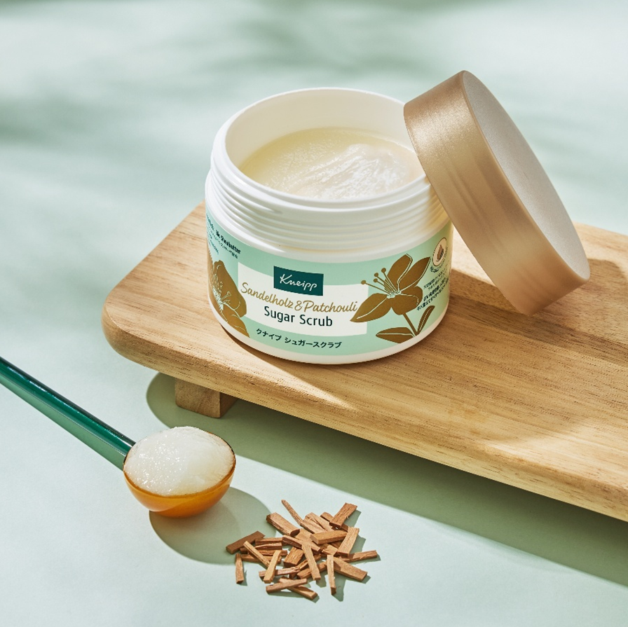 新登場のサンダルウッドは、スクラブカテゴリーではまだ展開の多くない、サンダルウッドオイルを配合した心落ち着くウッディな香りです。クナイプならではの自然由来の処方で、手に取りやすく、日常に取り入れやすいボディケアとしてお使いいただけます。さらにシアバターを配合することで、しっとりとした保湿保護効果を高め、きめ細かいふっくら肌に。脂性肌・乾燥肌を問わずお使いいただけます。日々のバスタイムで全身の角質ケアと保湿をしながら、心までリラックスし、うるおす時間へと導きます。