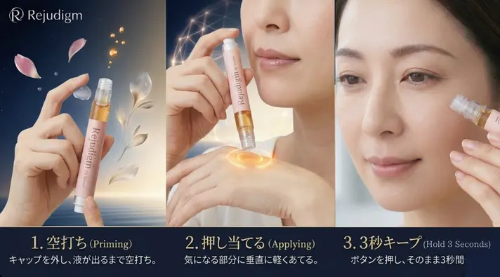 【初回ご使用時】 キャップを外し、容器先端部を上向きにして、美容液が出るまで数回「空打ち」をしてください。
