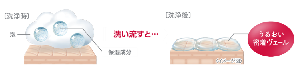 すすぎ時に、保湿成分が肌に密着しやすいヴェールに変化し、