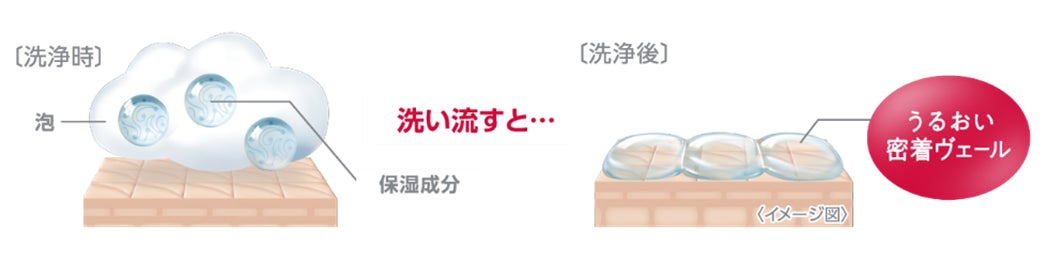・独自の「うるおい密着ヴェール」。すすぎ時に、保湿成分が肌に密着しやすいヴェールに変化し、全身にうるおいを与えます。