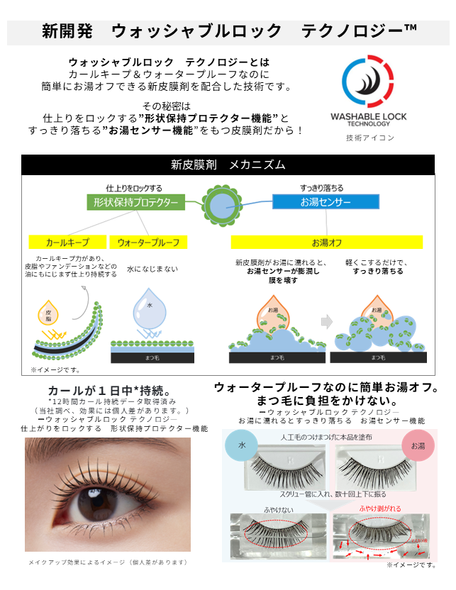 さらに、カールキープ・ウォータープルーフ・簡単お湯オフの3機能を同時に実現した新技術「ウォッシャブルロック テクノロジー™」が、夏の「にじみたくない、でも楽に落としたい」という願いを叶えます。