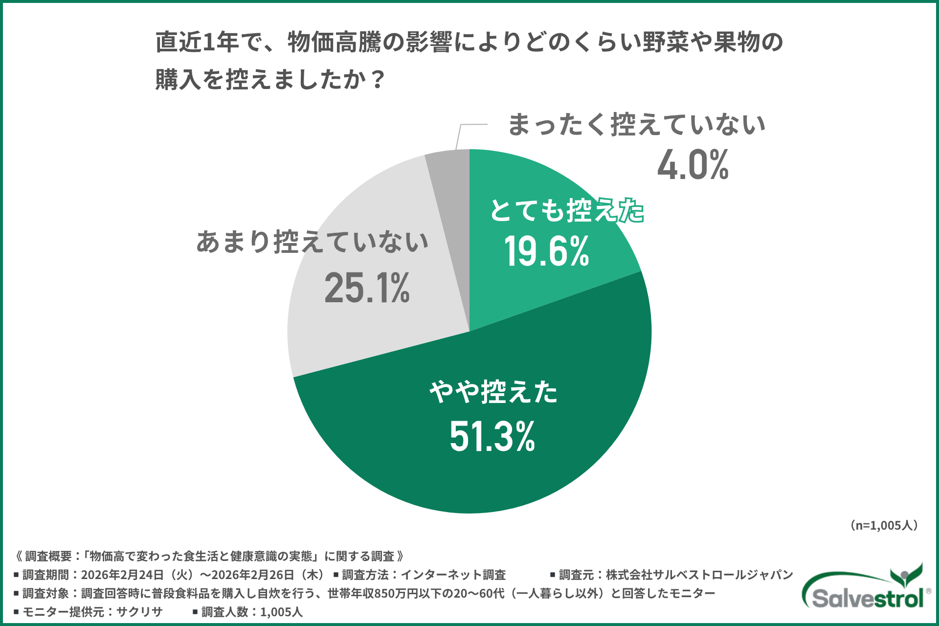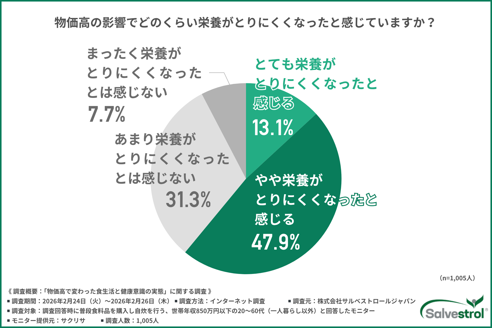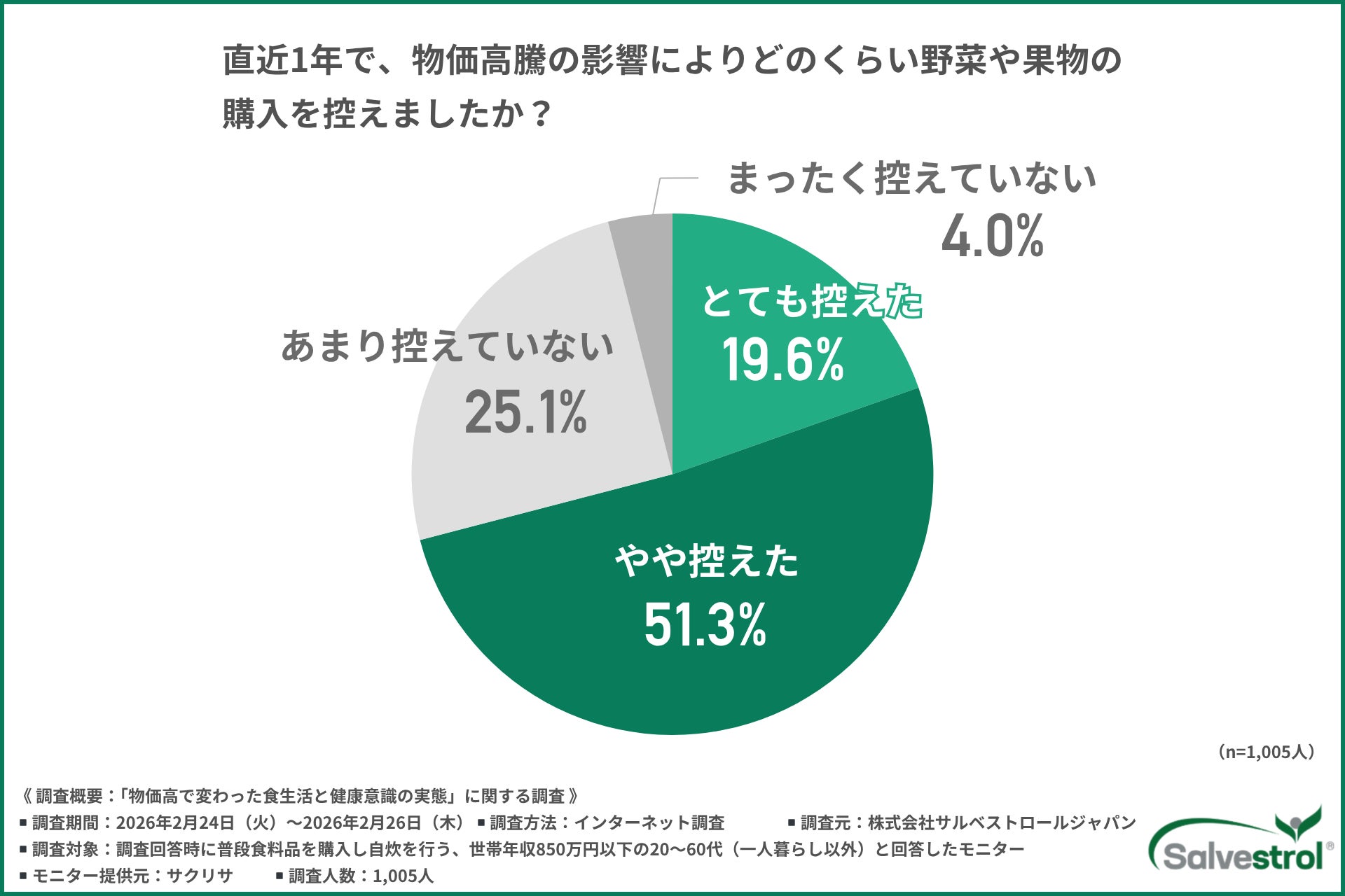 株式会社サルベストロールジャパン(所在地:東京都渋谷区)は、物価高の影響を実感している世帯年収850万円以下の20~60代(※一人暮らしを除く)を対象に、「物価高で変わった食生活と健康意識」に関する調査を実施しました。