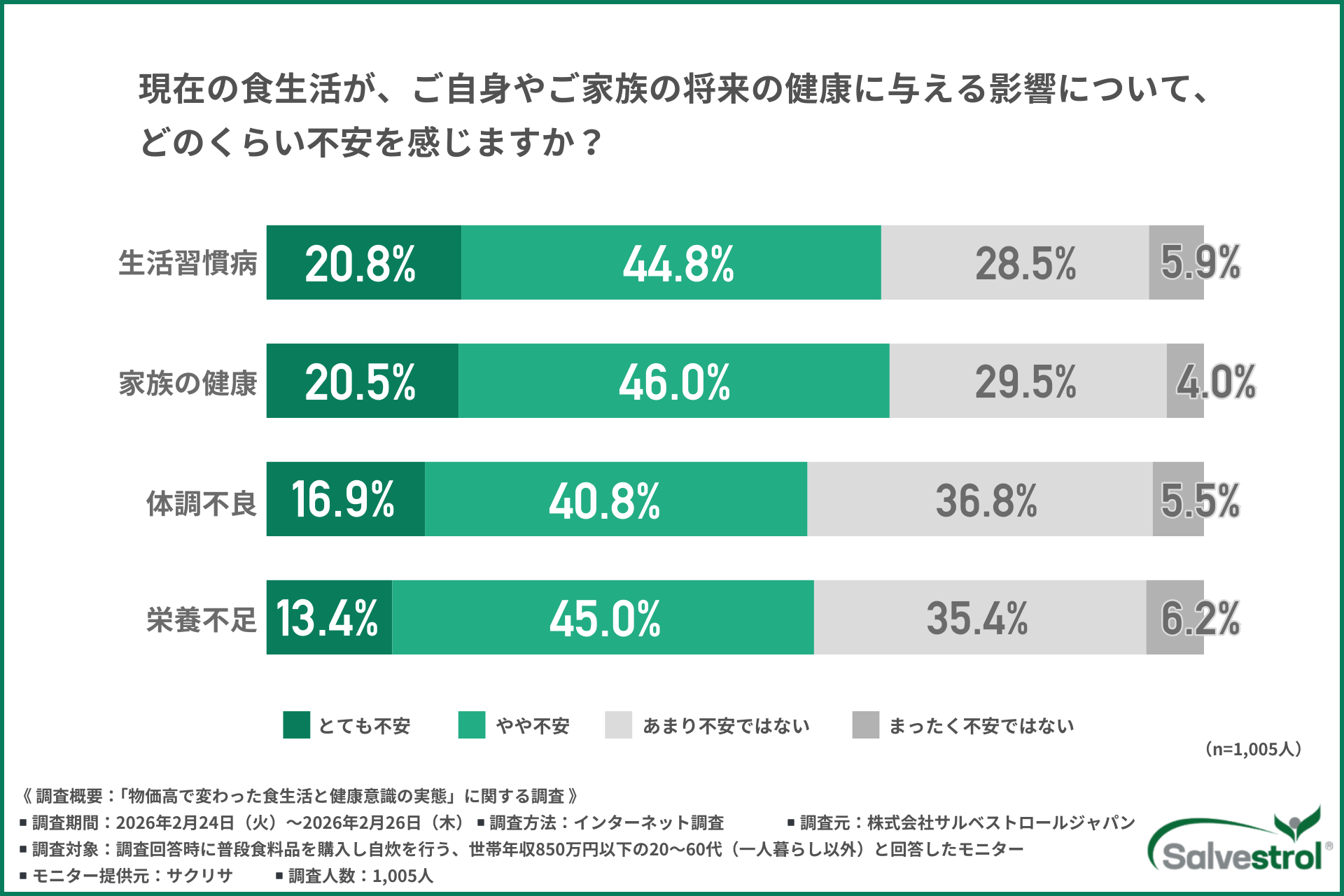 その結果、生活習慣病、家族の健康、体調不要、栄養不足といった項目について、約6割が不安を感じていると回答しました。