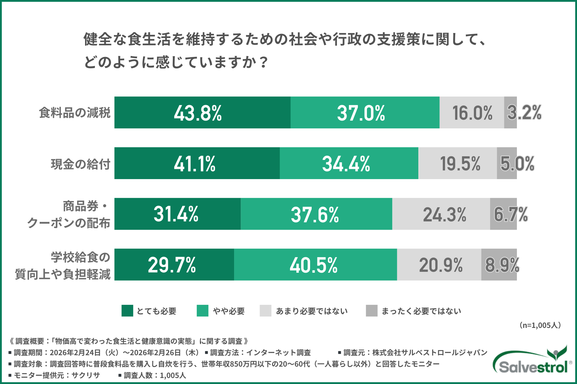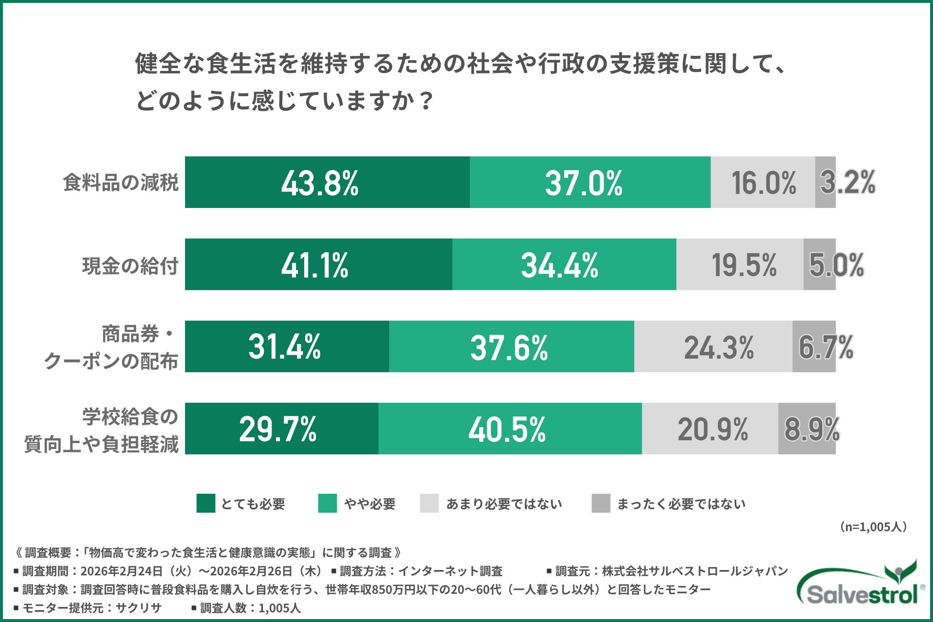また、約8割が「食料品の減税」などの公的支援を求めていることは、物価高による栄養不足の問題が、個人の工夫や努力の限界を超えた社会的課題であることを示唆しています。