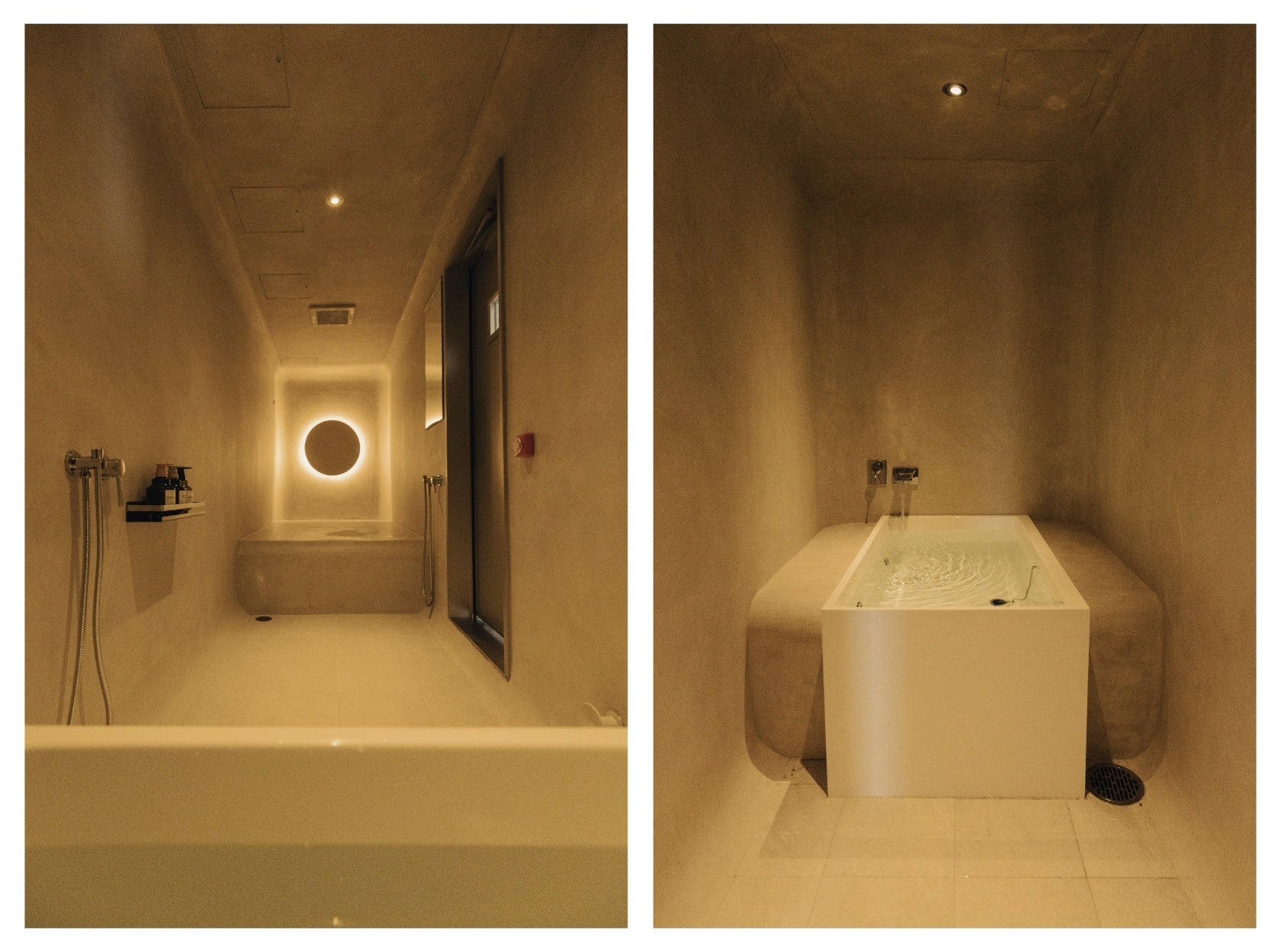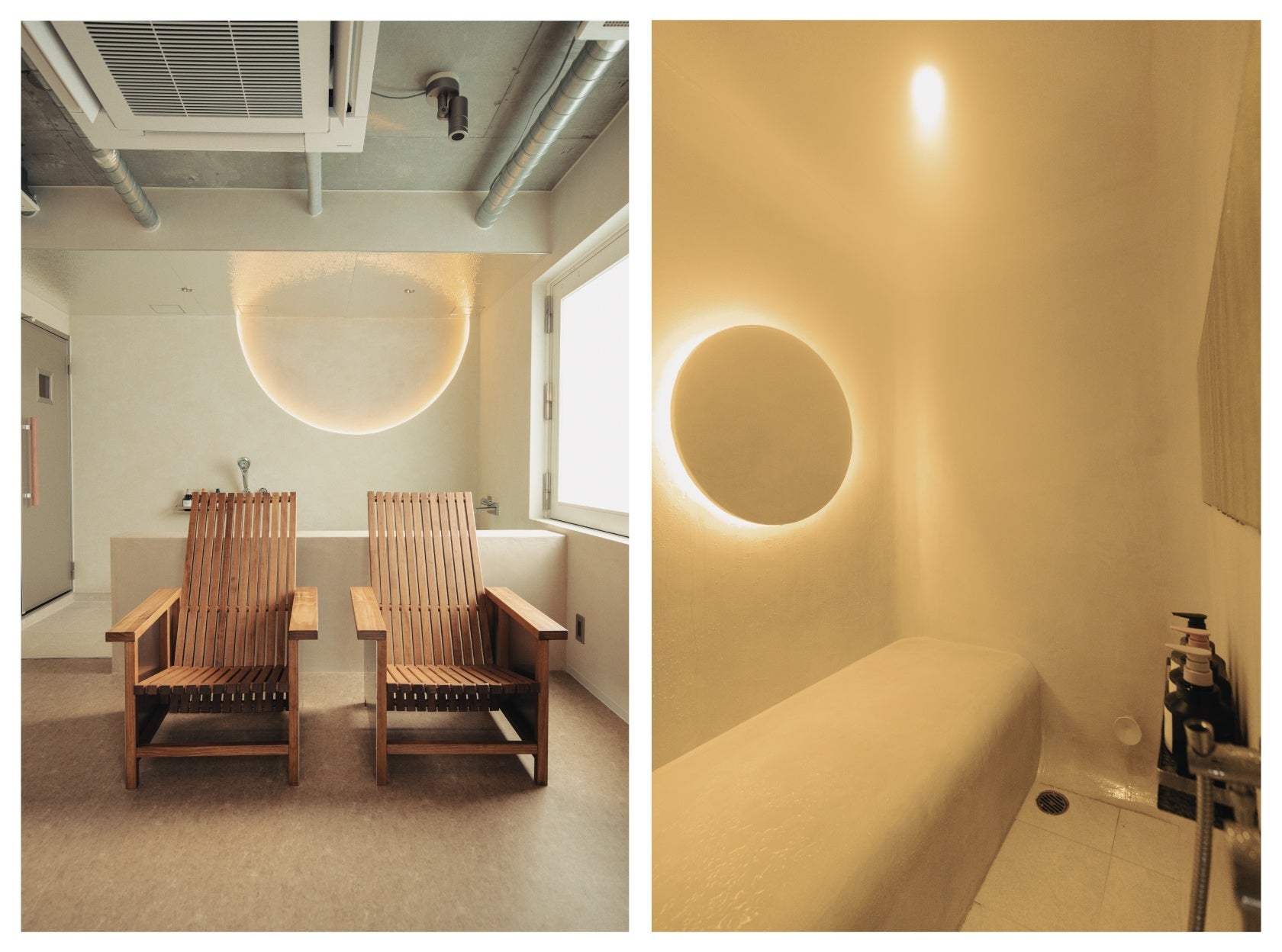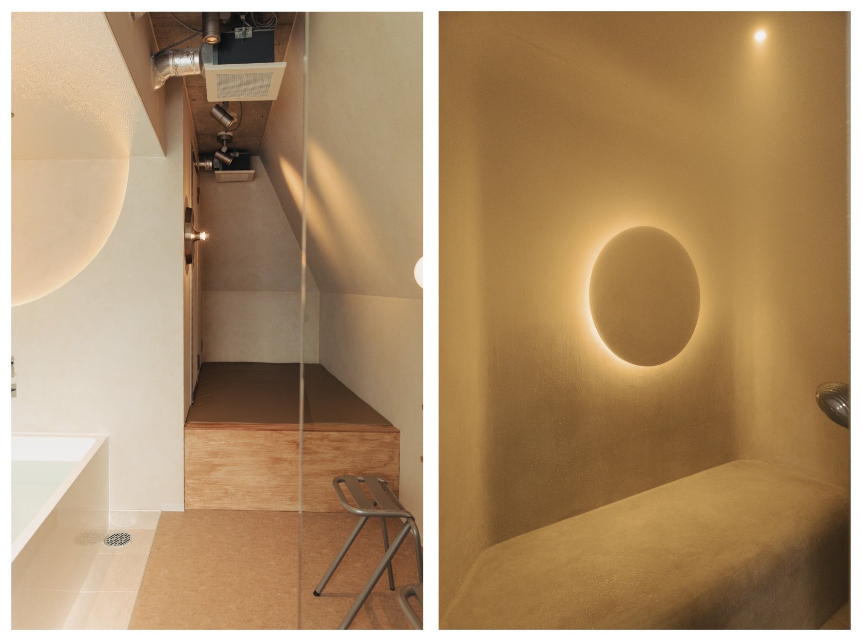 空間全体は、入口からサウナ室に向かうにつれて霧の中に入っていくようなグラデーションを設計し、日常からととのいの世界へ自然に移行していく体験の流れを意識しています。円形の照明は視線を1点に集中させ、ととのいに意識を向けやすい空間構成としています。コンパクトでありながら、視覚的な広がりと没入感を感じられるよう設計しました。