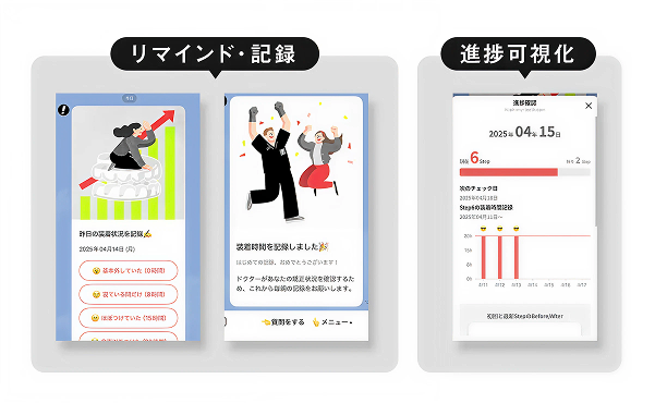 毎日の装着時間の可視化とリマインド: 毎日LINEで装着時間を報告・記録。専門医療チームからのこまめなメッセージでうっかり忘れを防ぎ、モチベーションを維持しながら習慣化をサポートします。