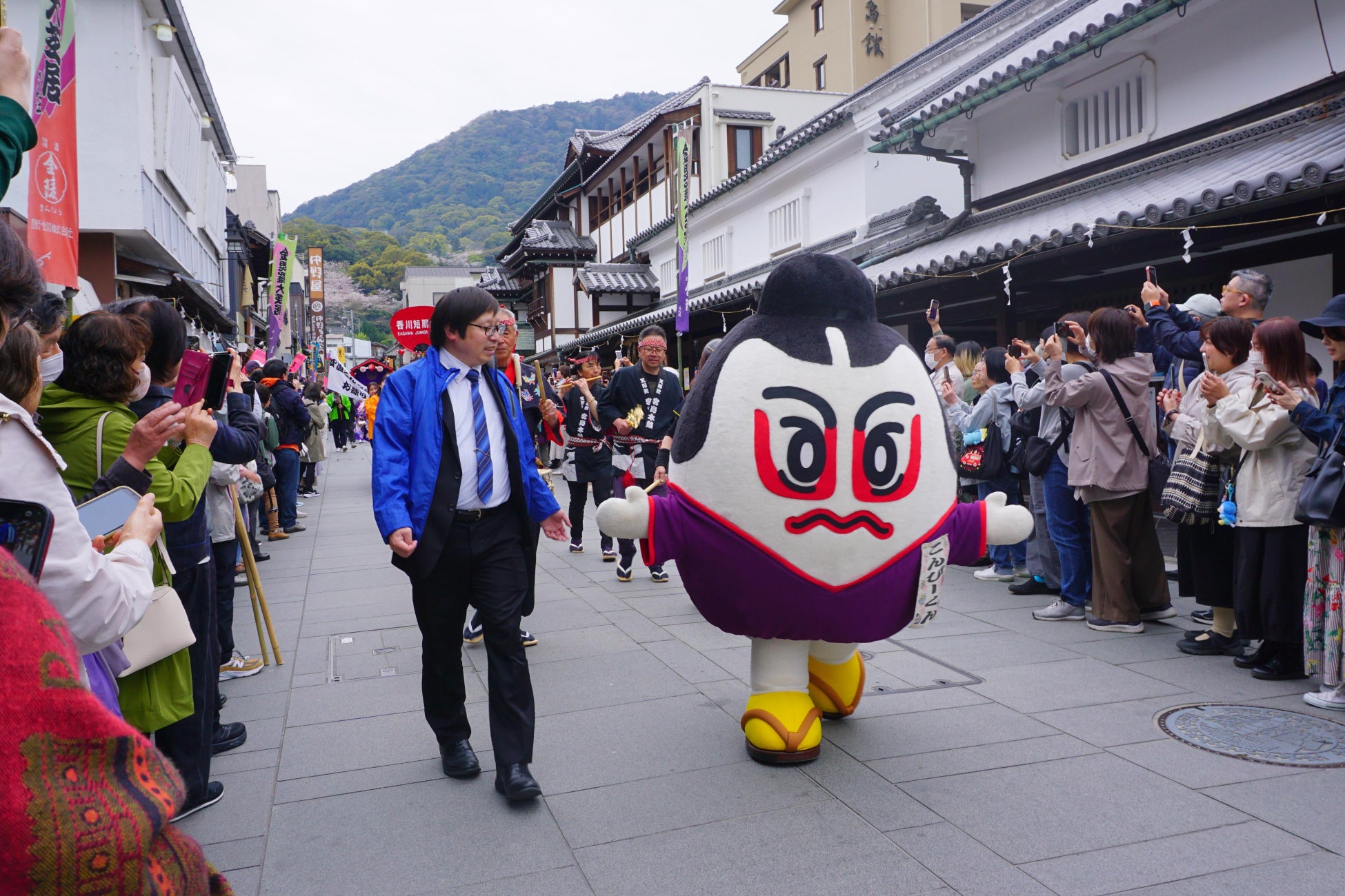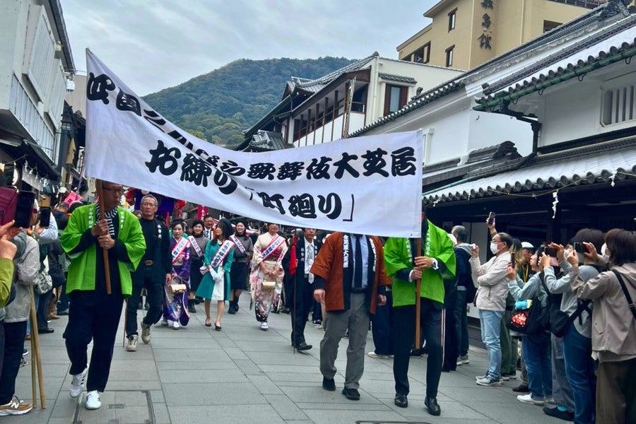 公演に先立ち4月9日(木)に行われた、出演俳優が人力車で街を練り歩く伝統行事「お練り」には、当社代表の八重樫も参加いたしました。沿道を埋め尽くす地域住民や観光客の皆様と共に声を出し、香川の春を祝う喜びを分かち合いました。