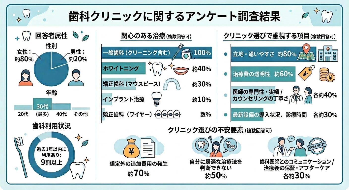本調査では、医師取材記事の分析に加え、実際に歯科クリニックの受診を検討したことがある生活者100名を対象にアンケートを実施。歯科クリニックの受診状況や興味のある分野、クリニック選びの基準、不安に思っていることなどを多角的に分析しました。