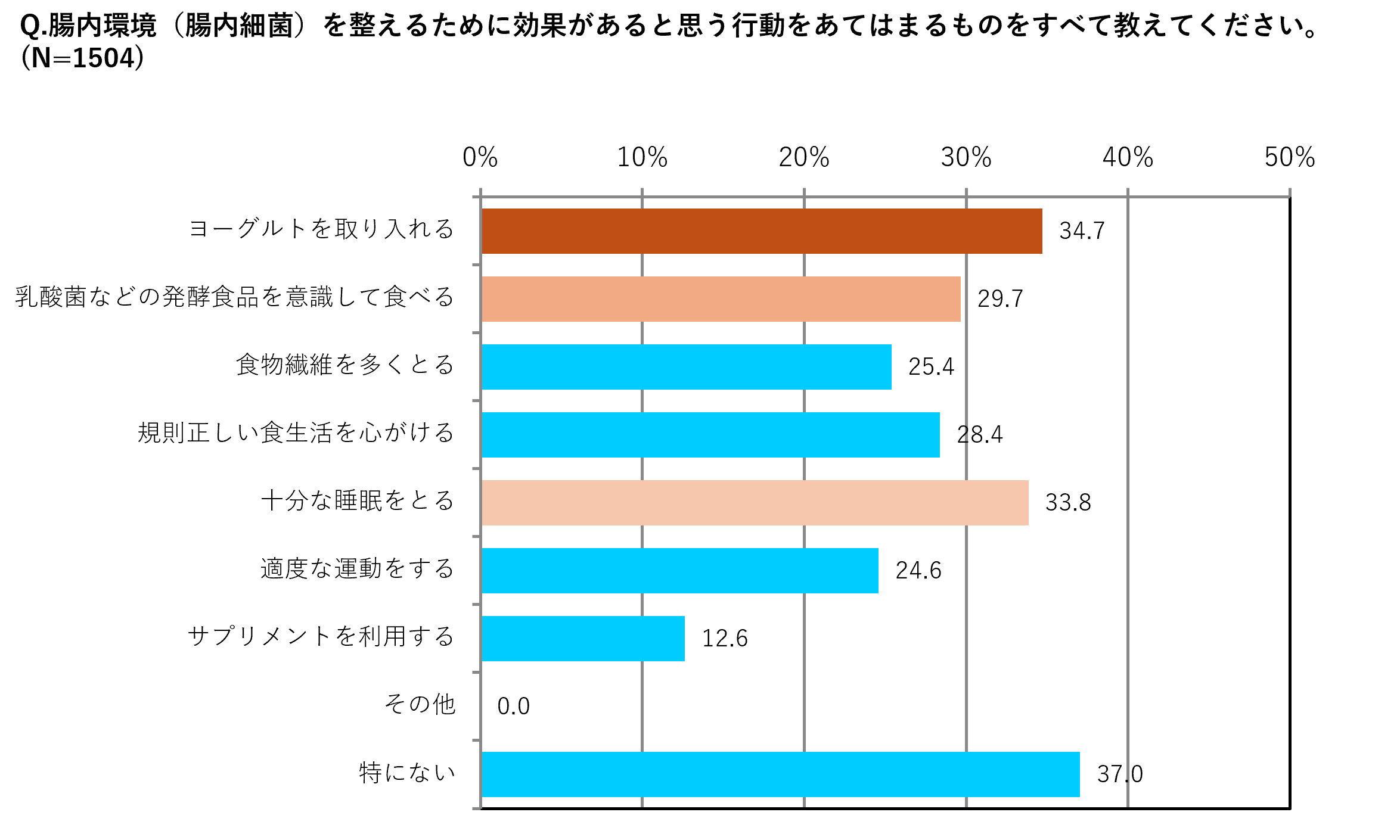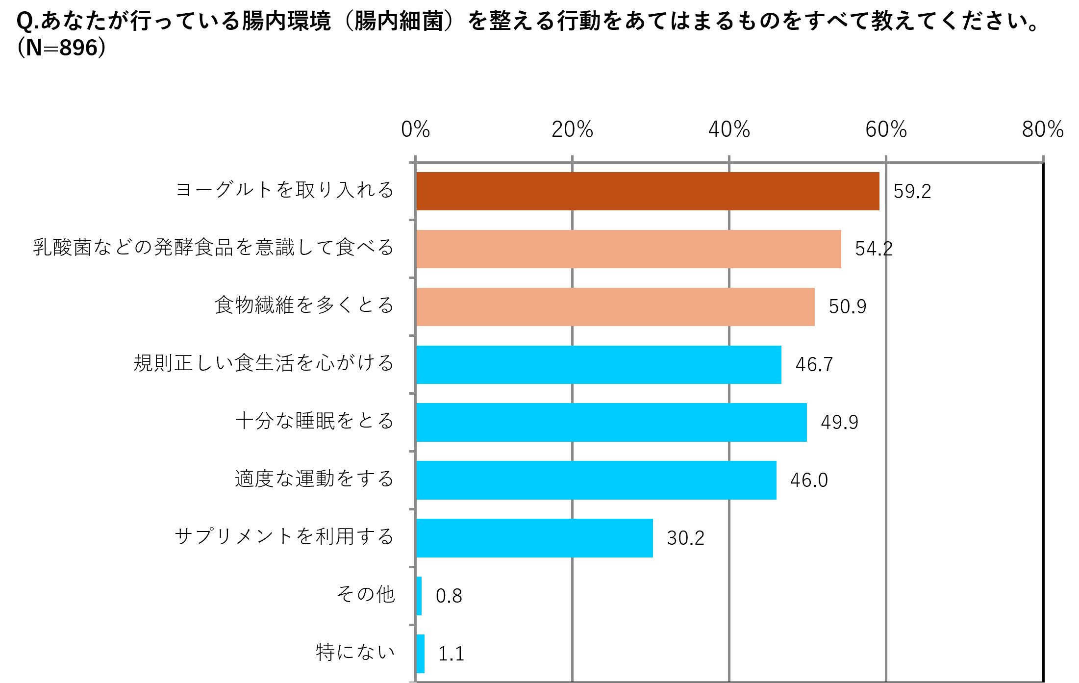 ・腸活を実践している人の対策は「1位:ヨーグルト(59.2%)」、「2位:乳酸菌などの発酵食品(54.2%)」、「3位:食物繊維(50.9%)」