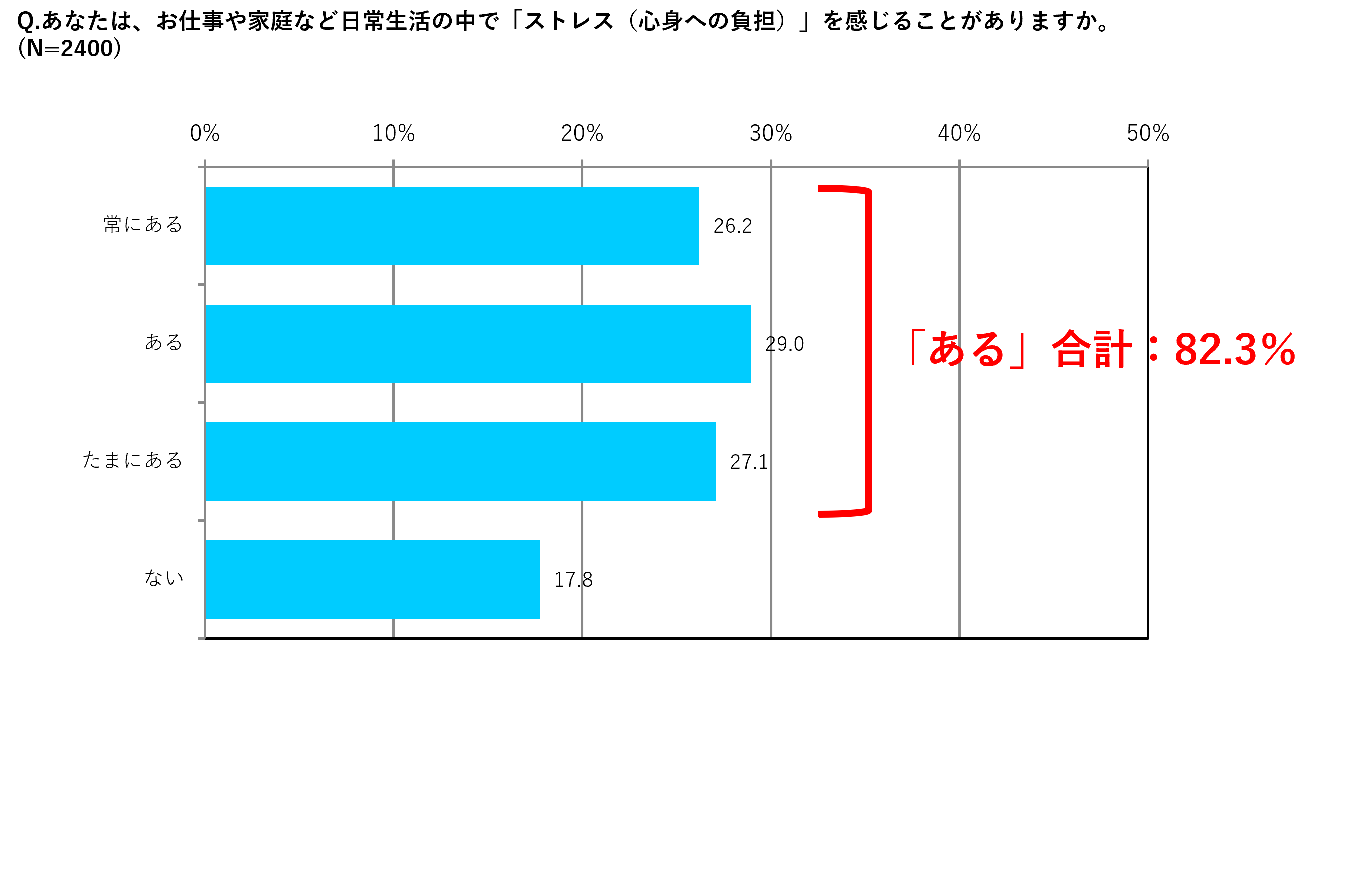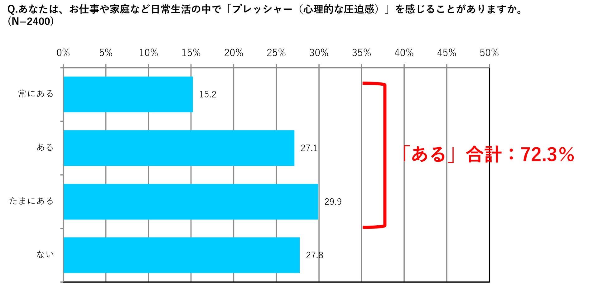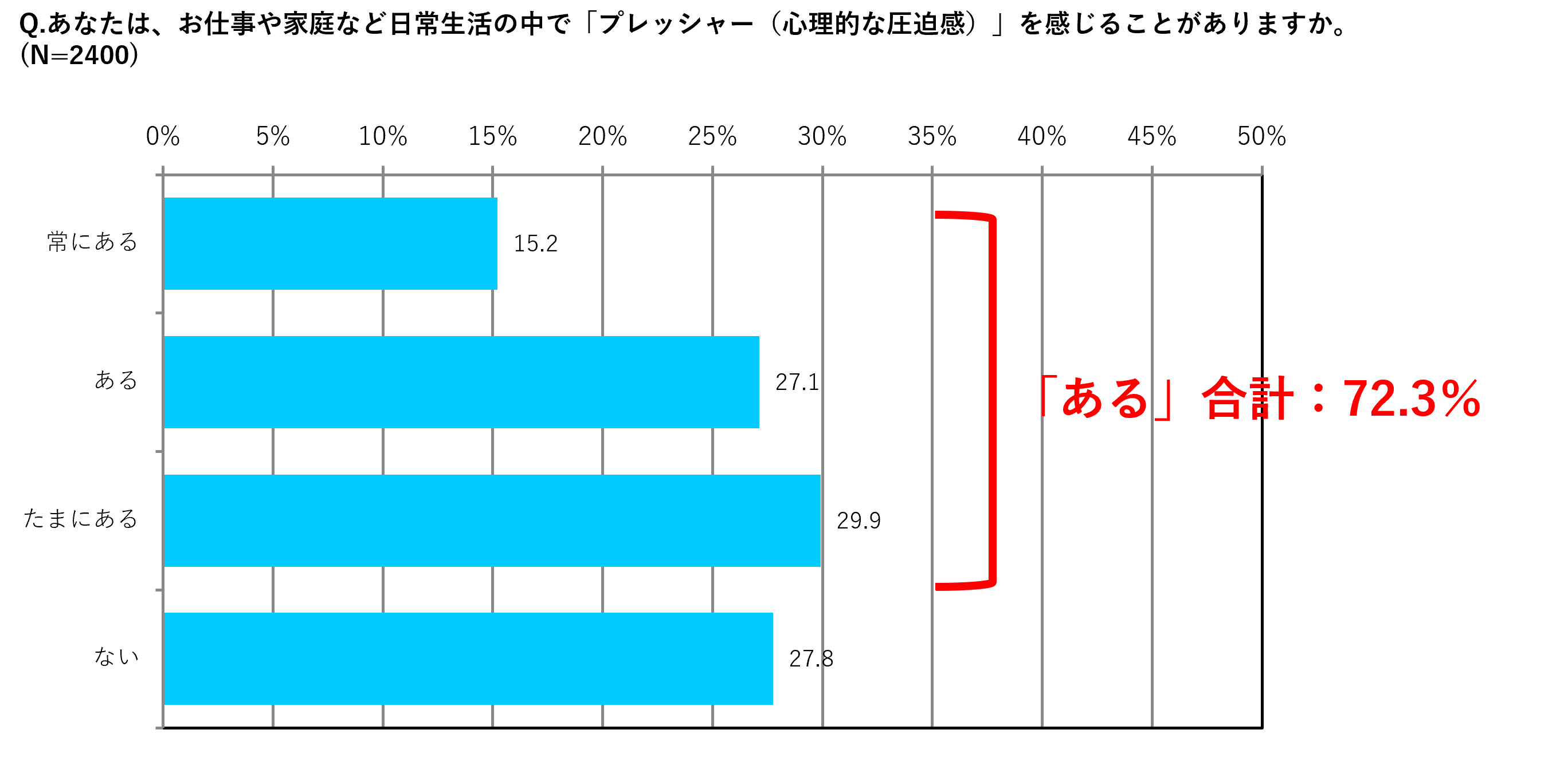 ・日常生活でストレスを感じている人は82.3%、プレッシャーを感じている人は72.3%。