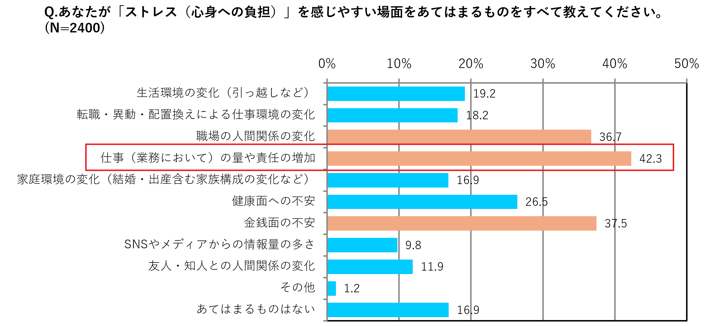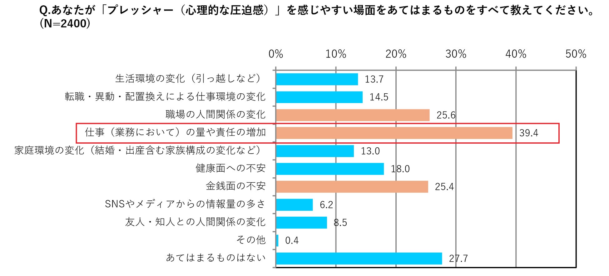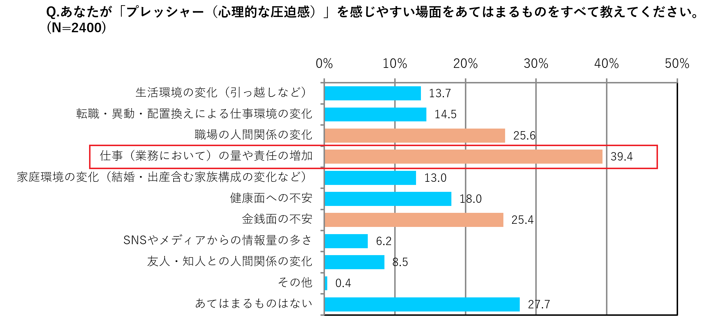 ・ストレスを感じる場面としては「仕事(業務)の量や責任の増加(42.3%)」が最も多く、同様にプレッシャーも「仕事(業務)の量や責任の増加(39.4%)」がトップに。