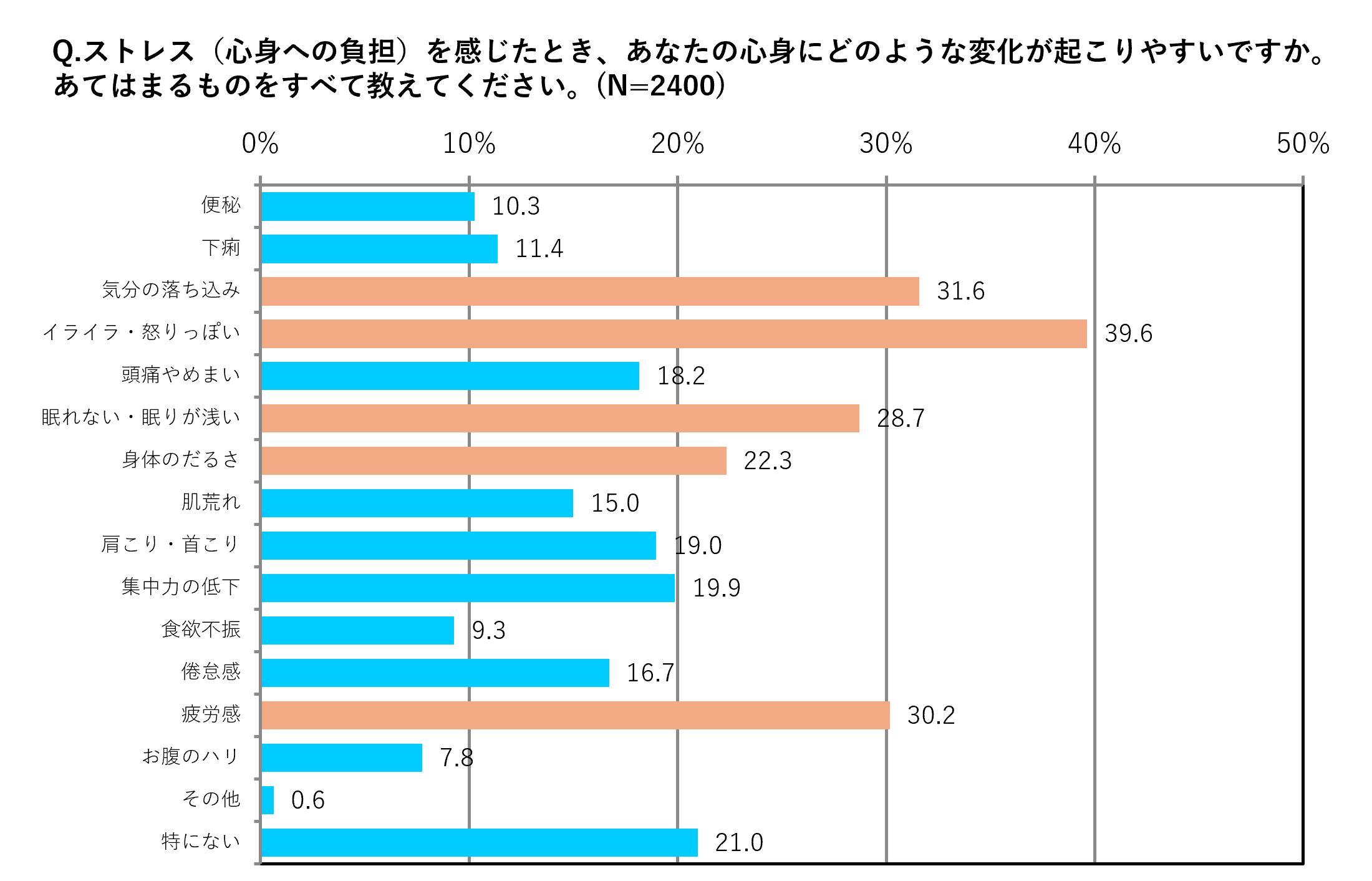 ストレスを感じた際の心身への影響としては、「イライラ・怒りっぽくなる(39.6%)」が最も多く、続いて「気分の落ち込み(31.6%)」「疲労感(30.2%)」「睡眠障害(28.7%)」「身体のだるさ(22.3%)」が上位に挙がりました。