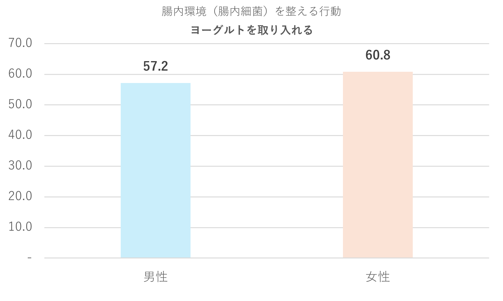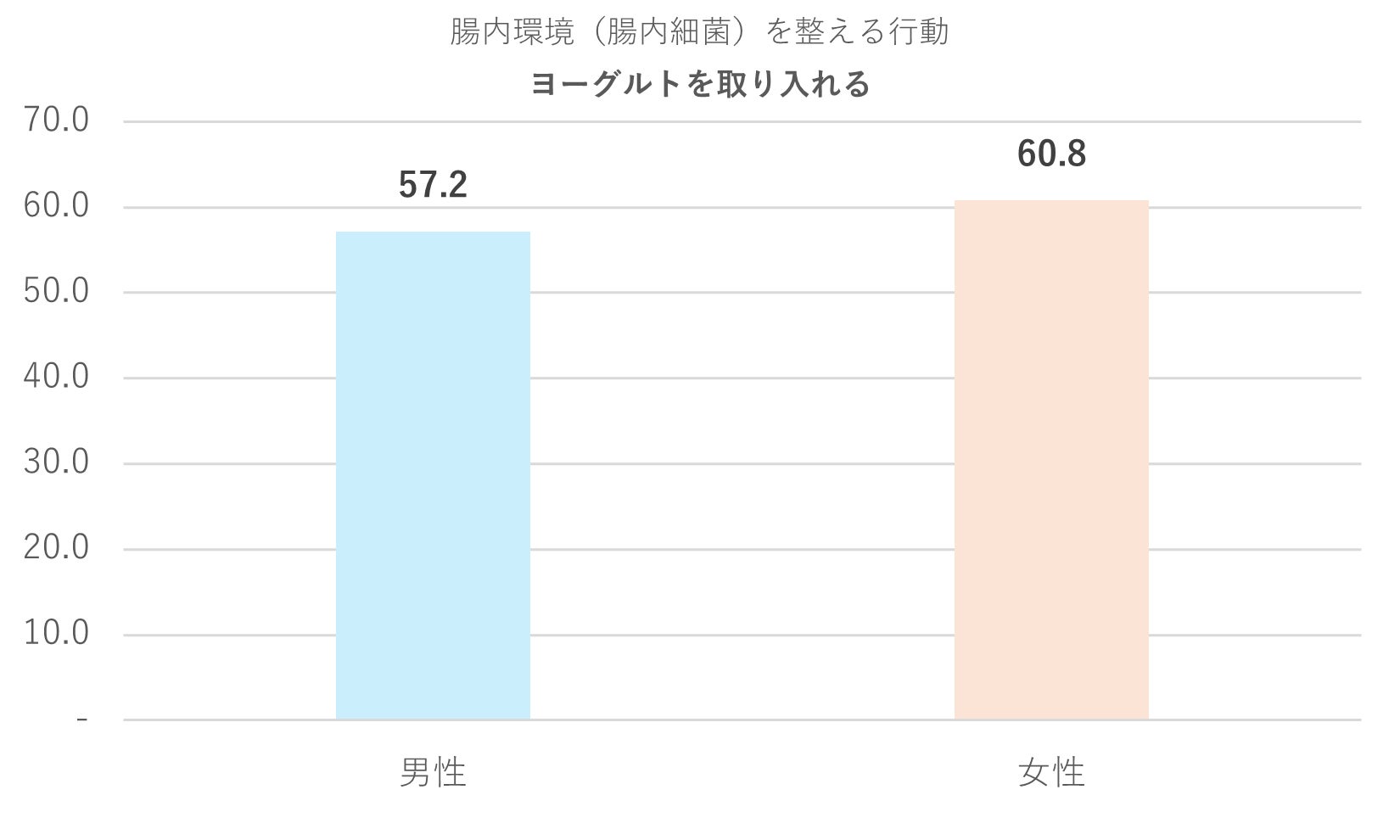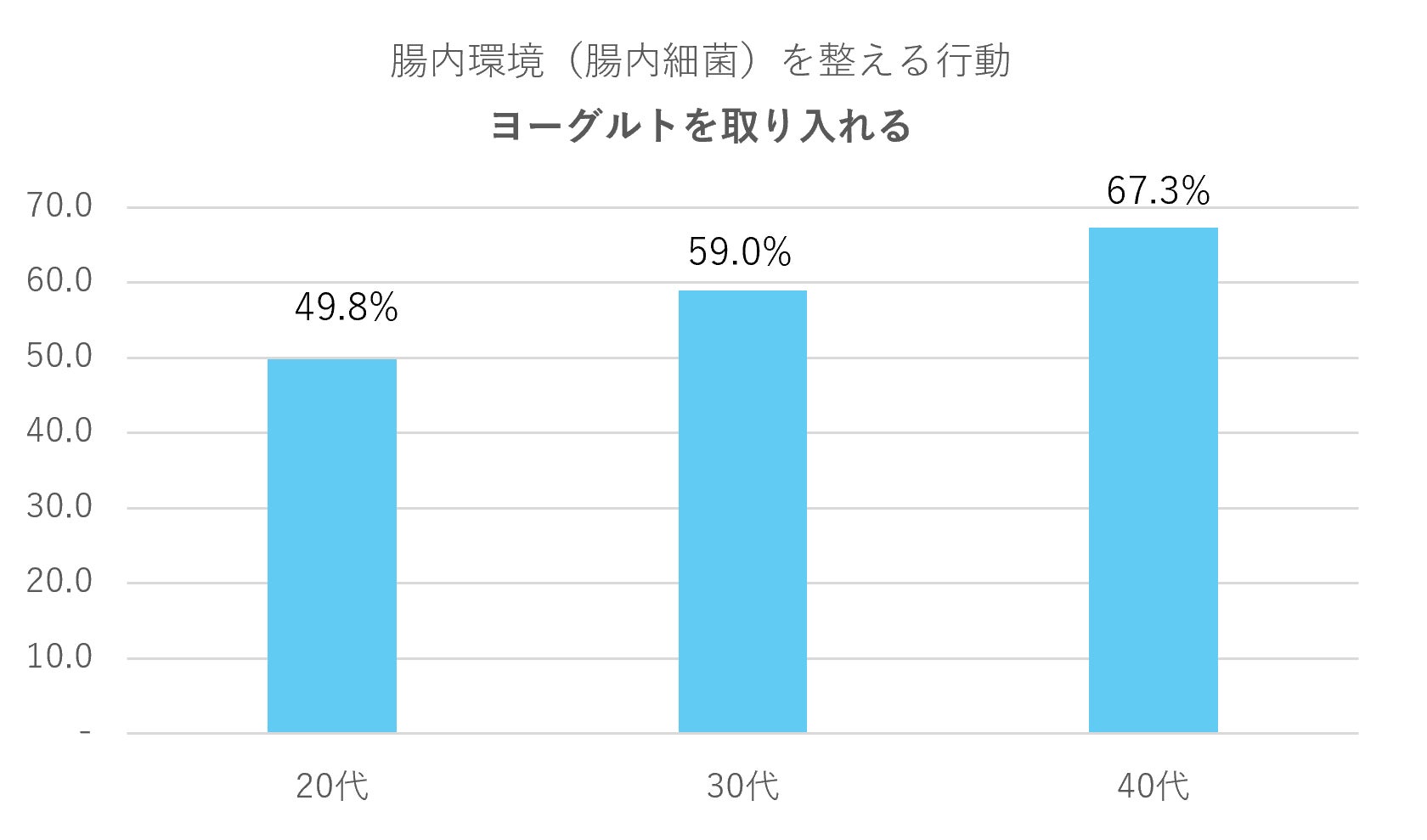 また、「腸活としてヨーグルトを取り入れている」人の年代を区切ってみると、20~40代間では年代が高くなるほど割合が増え、男女の比較では女性の方が取り入れている割合が多いことが分かりました。