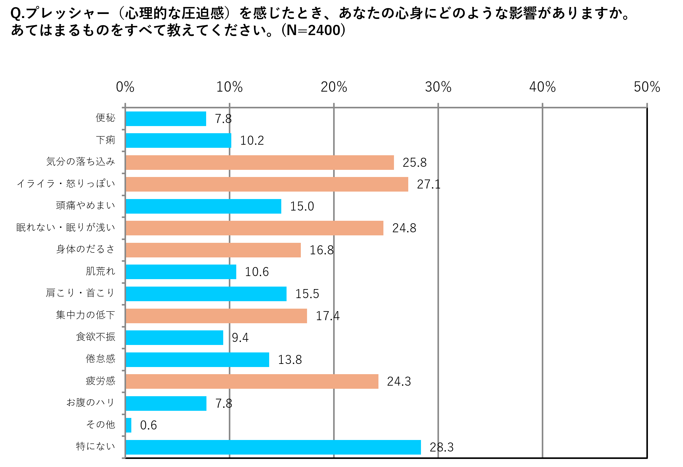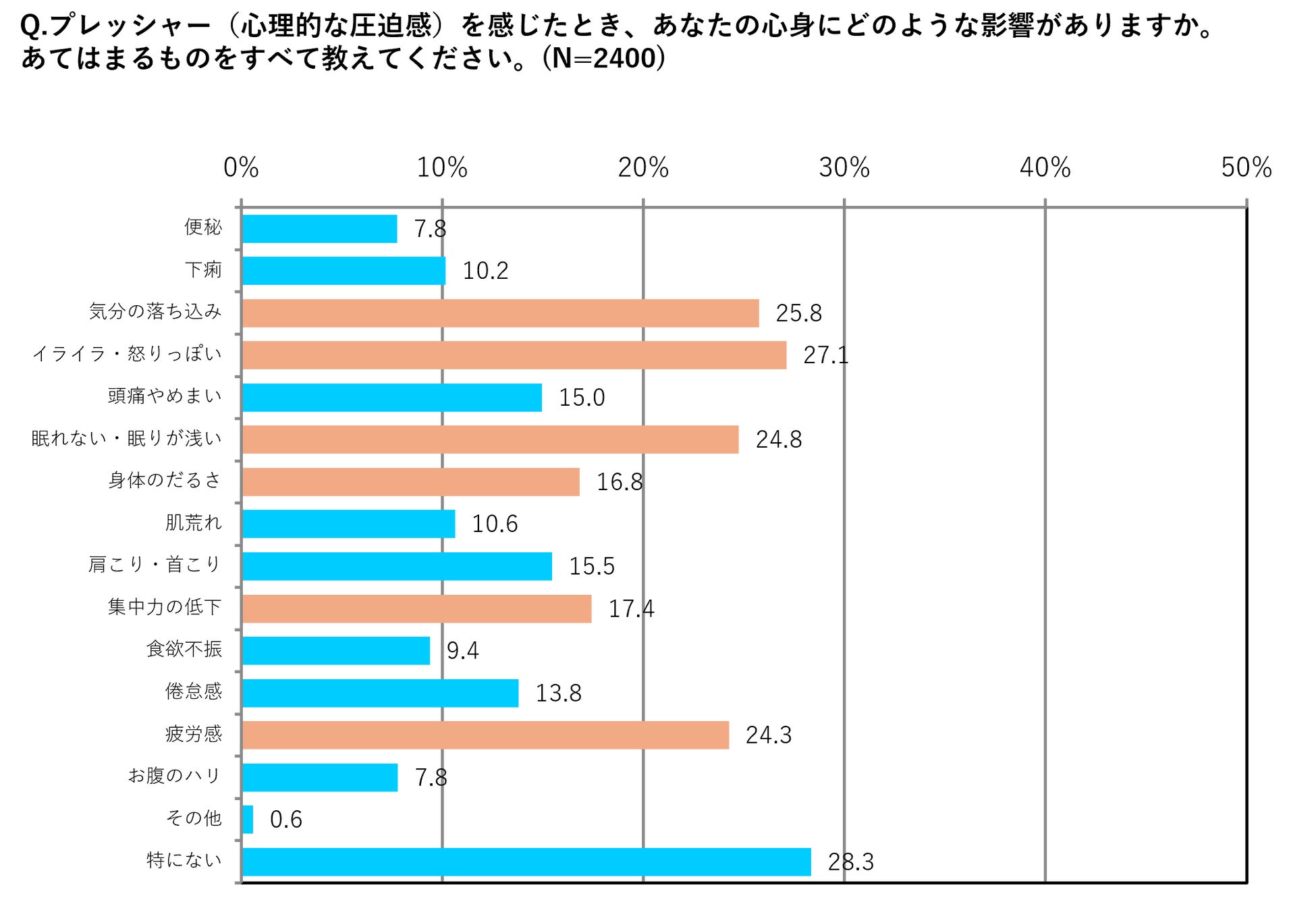 一方、プレッシャーを感じた際の心身への影響でも、「気分の落ち込み(25.8%)」「睡眠障害(24.8%)」「疲労感(24.3%)」「集中力の低下(17.4%)」が続きました。