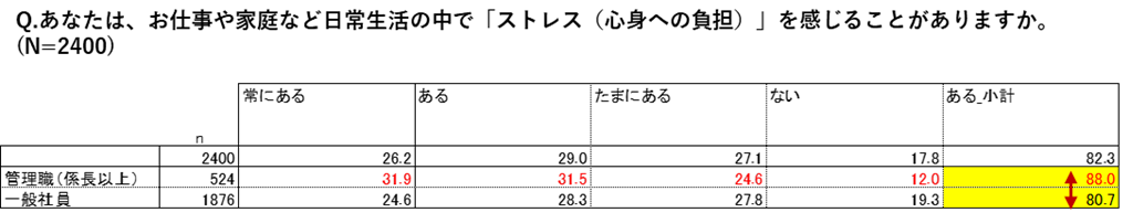 調査結果を「一般社員」と係長以上の「管理職」に区切って集計をしたところ、ストレス・プレッシャーによる影響を受けている人の割合は、「一般社員」よりも「管理職」のほうが高いと言う結果になりました。