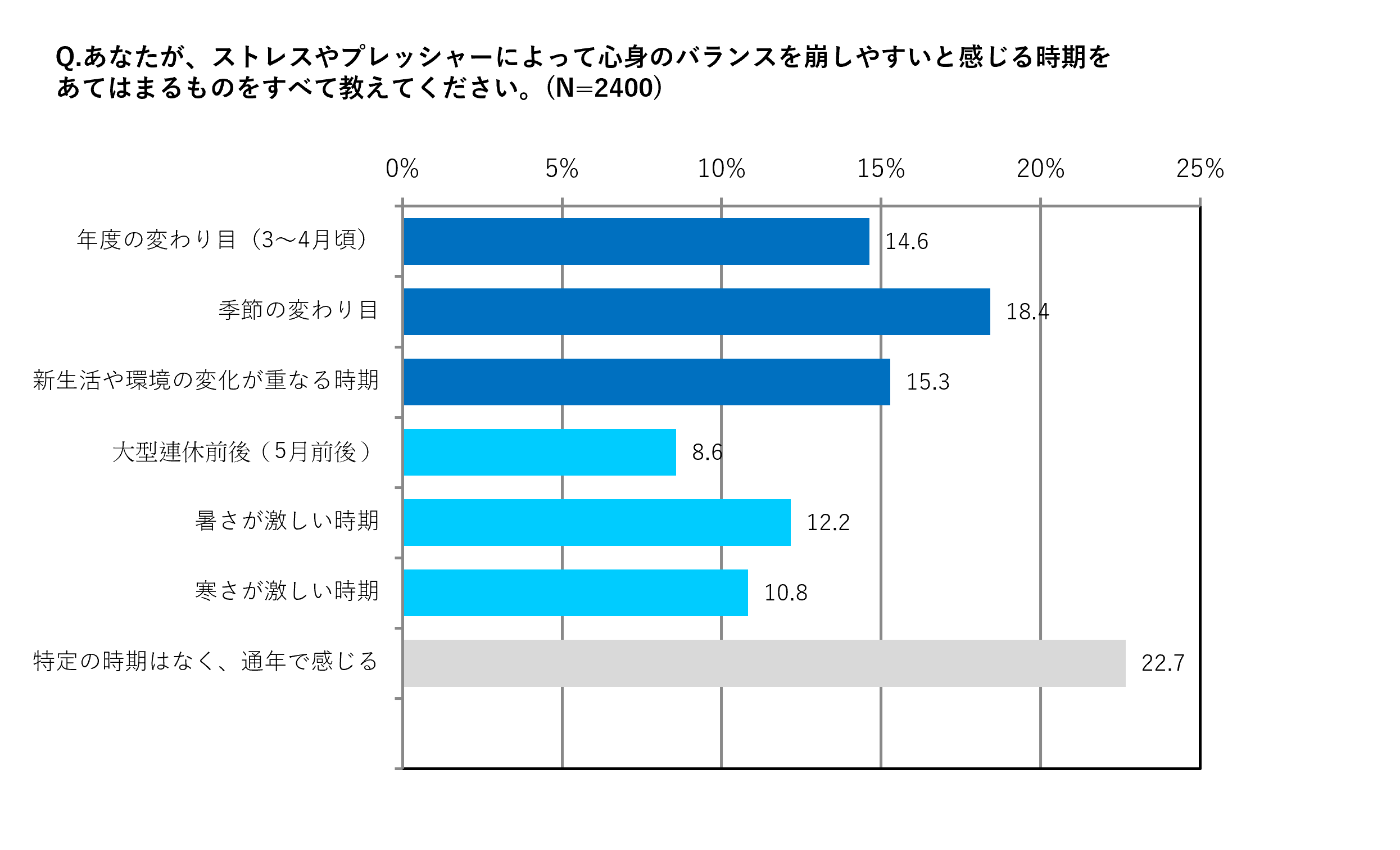 ・ストレスやプレッシャーにより心身のバランスを崩しやすい時期は、「1位:季節の変わり目(18.4%)」「2位:新生活や環境の変化が重なる時期(15.3%)」「3位:年度の変わり目(14.6%) 」と新生活や季節の変わり目などの“変化“があるタイミングが上位を占めた。