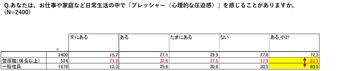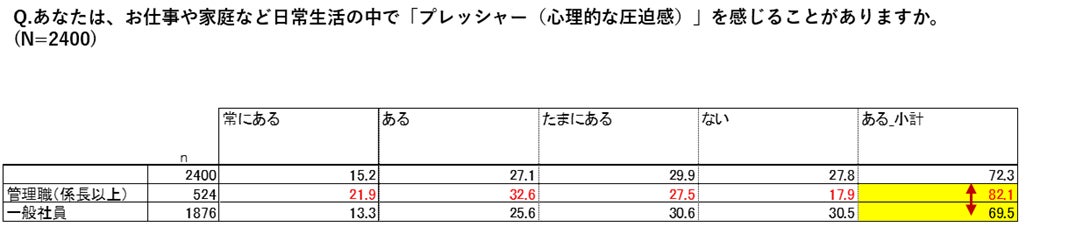 調査にあるように「管理職」の方がストレスやプレッシャーを感じやすいことは事実あると思います。ただし、意外に思われるかもしれませんが、最近の傾向では、新入社員などの比較的若い人も精神的な負担を抱えている傾向にはあると思います。管理職の人はストレスやプレッシャーに耐えうる精神を持っているからこそ、そのような役職まで辿り着いているとも言える側面も有ると思いますので、「役職」はもちろんですが、個々人の「耐性」による部分が大きいかもしれませんね。