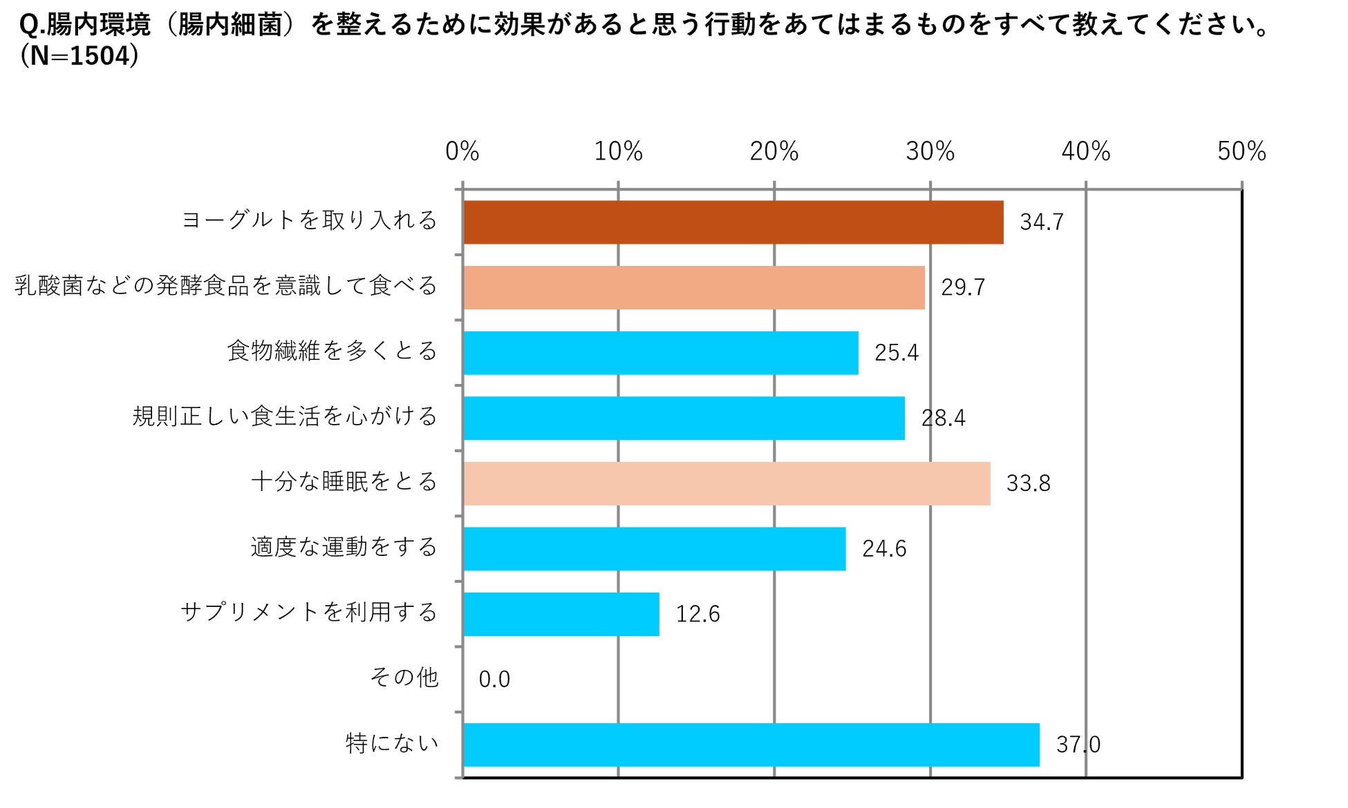 腸活の実践内容として最も多かったのは「ヨーグルトを取り入れる」(59.2%)、続いて「乳酸菌などの発酵食品の摂取」(54.2%)、「食物繊維の摂取」(50.9%)が続きました。また、腸活をしていない人においても、腸内環境に良いと思う行動として「ヨーグルト」が1位(34.7%)に挙がっており、ヨーグルトが生活者にとって“腸活の代表的手段”として広く定着していることが示されました。