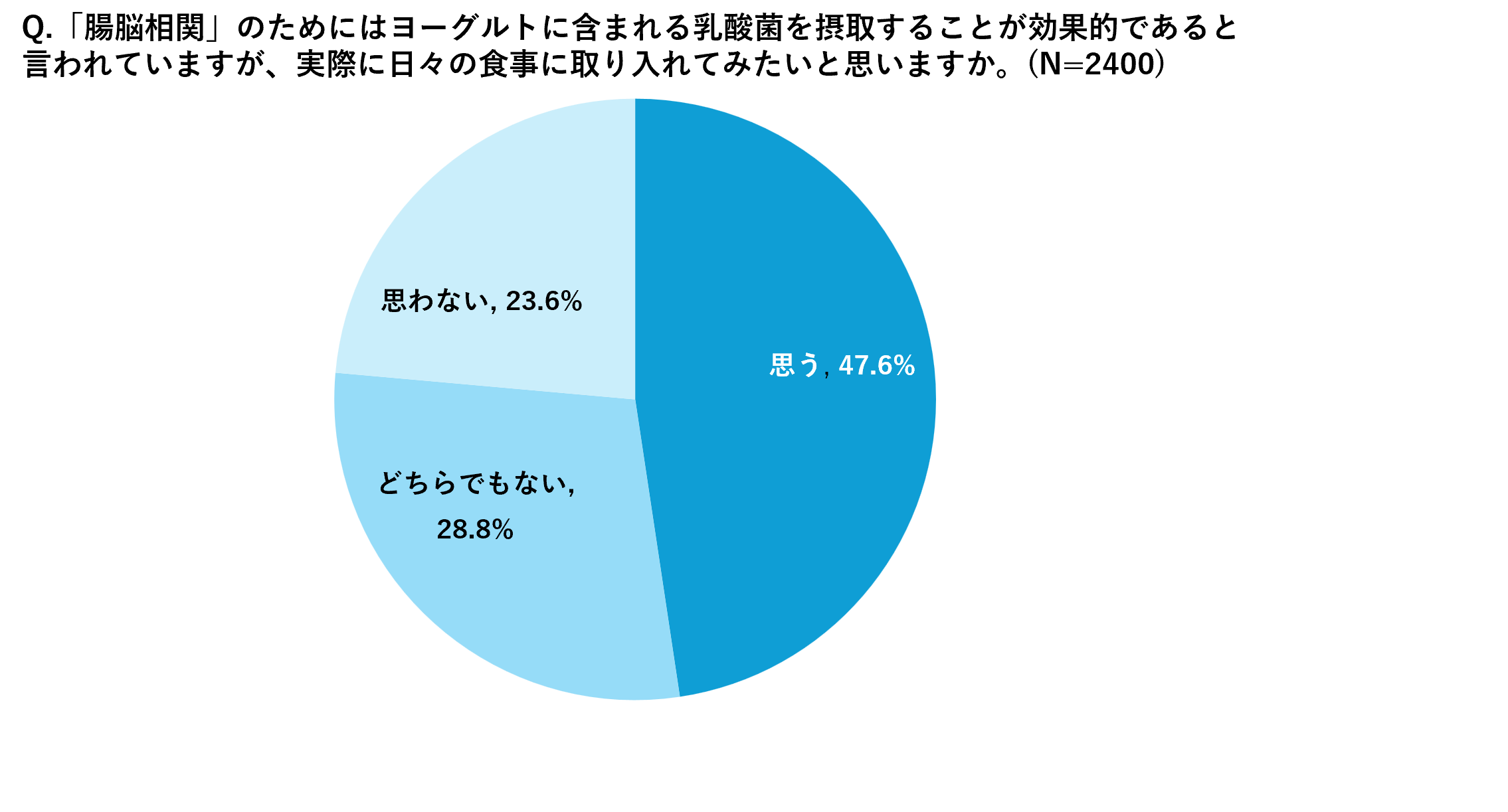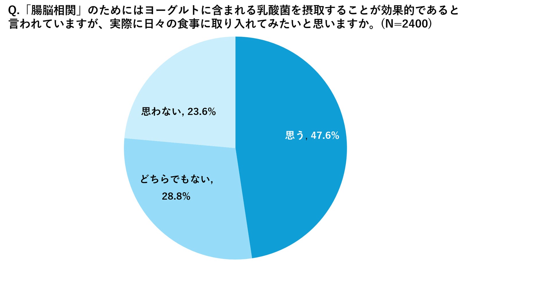 ストレスやプレッシャーと腸内環境の関係性を「知らない」とする人は半数(55.0%)を超えました。一方で、腸内環境(腸内細菌)と脳が繋がり双方向に影響し合っている「腸脳相関」のためにヨーグルトを摂りたい人は約5割にのぼりました。