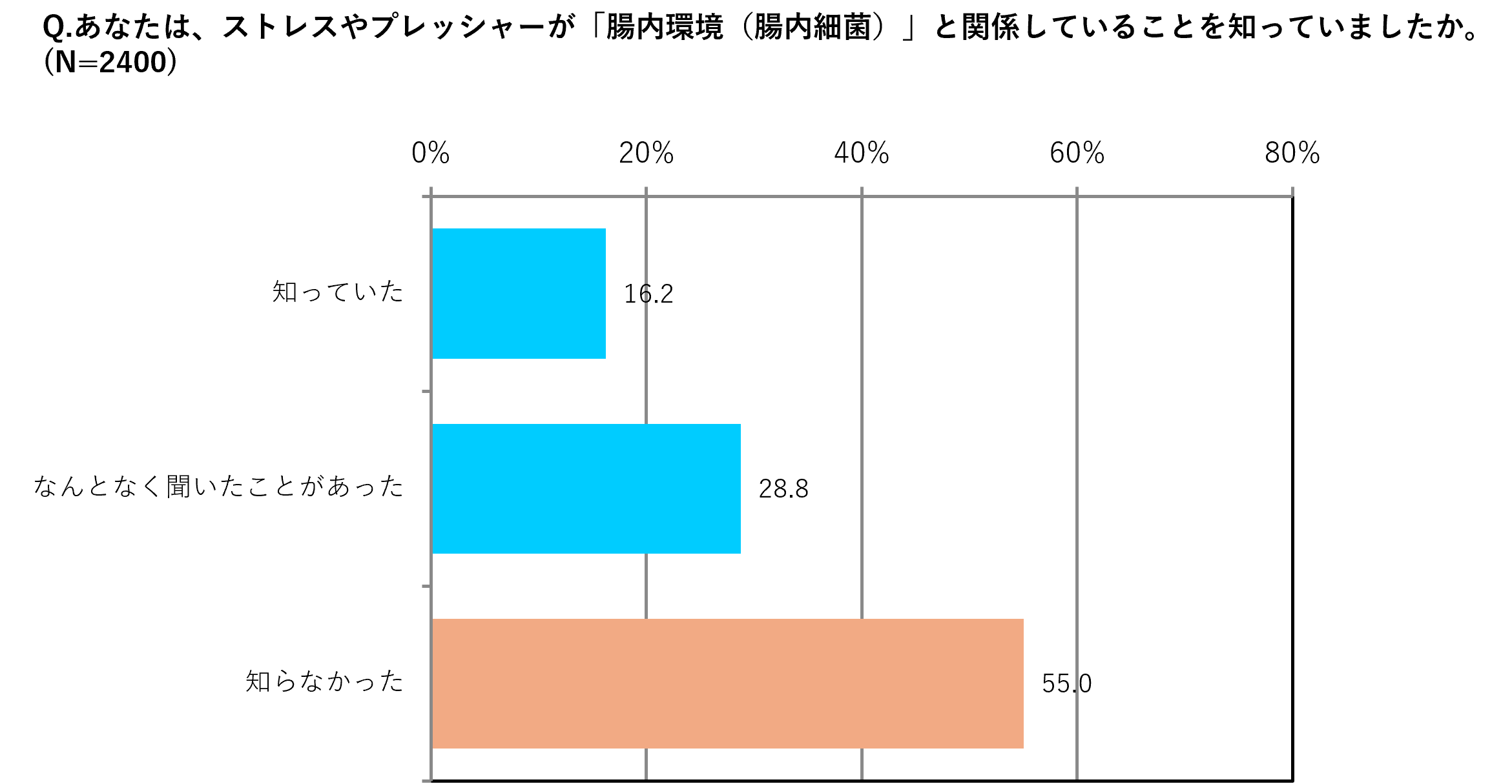 ・「ストレス・プレッシャーと腸内環境の関係(腸内環境と脳がリンク=腸脳相関)」は55.0%が知らない。