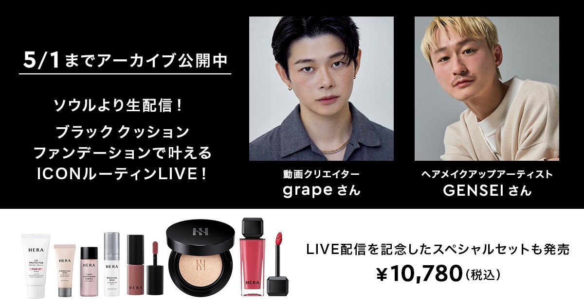 イベント翌日の4月18日(土)20時より、日本から来場したGENSEIさんとgrapeさんによるライブ配信を実施。《THE ICONIC BLACK》の会場の様子や体験コンテンツ、現地でのリアルな感想を交えながら、〈ブラック クッション ファンデーション〉を含むHERAのベースメイクルーティンを存分に楽しむことが出来る〈HERA ベストセレクションセット〉についてご紹介いただきました。公式オンラインストアにて本配信のアーカイブを5月1日(金)まで公開中です。